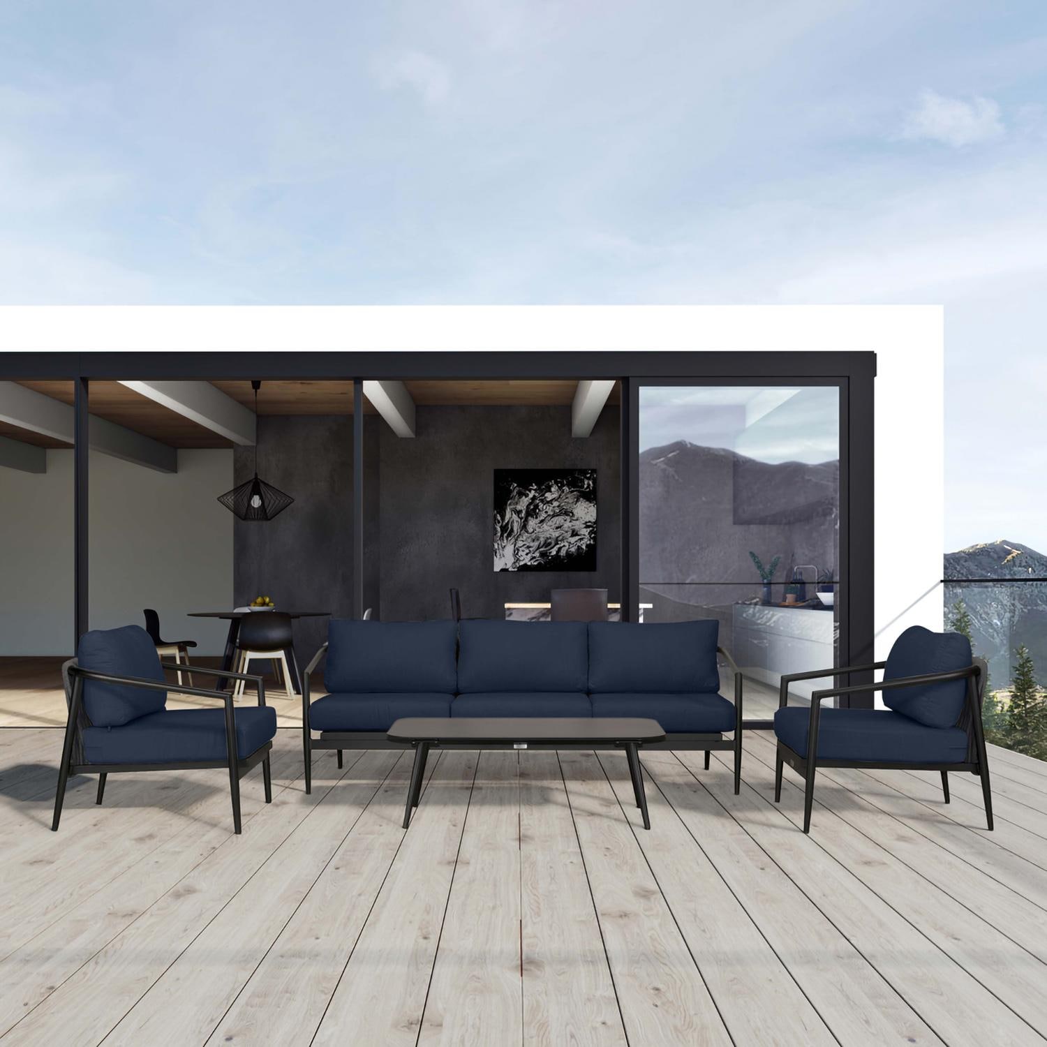 The Midnight Cove 4 Piece Sofa Set in a Black finish with Spectrum Indigo cushions is an imagined Mid Century Modern design brought to life with Carbon Olefin rope. Accented with tapered legs, subtle curves and an intertwining roped back for flair, the silhouette of the Midnight Cove collection is a sophisticated work of art. Midnight Cove was efficiently designed to be both compact in its footprint while still offering full sized deep seating comfort. Its fully-welded aluminum frames are treated with a powder-coated finish to ensure lasting performance across the seasons. Beautiful Carbon Olefin rope compliment the frames making it both visually appealing and durable in all types of climates. The cushions are made in the USA with quick-drying, Dacron and UV-treated, marine-grade PremoBond thread to create a supportive, yet comfortable seat that is meant to last throughout the seasons. All cushions are constructed from Sunbrella performance fabrics, which carry a 5-year fade warranty. This piece is offered in 9 popular Sunbrella fabric options which are fade resistant, easy to clean, and ready to ship within days of placing an order! The sleek, aluminum table perfectly compliments the rest of the deep seating set!