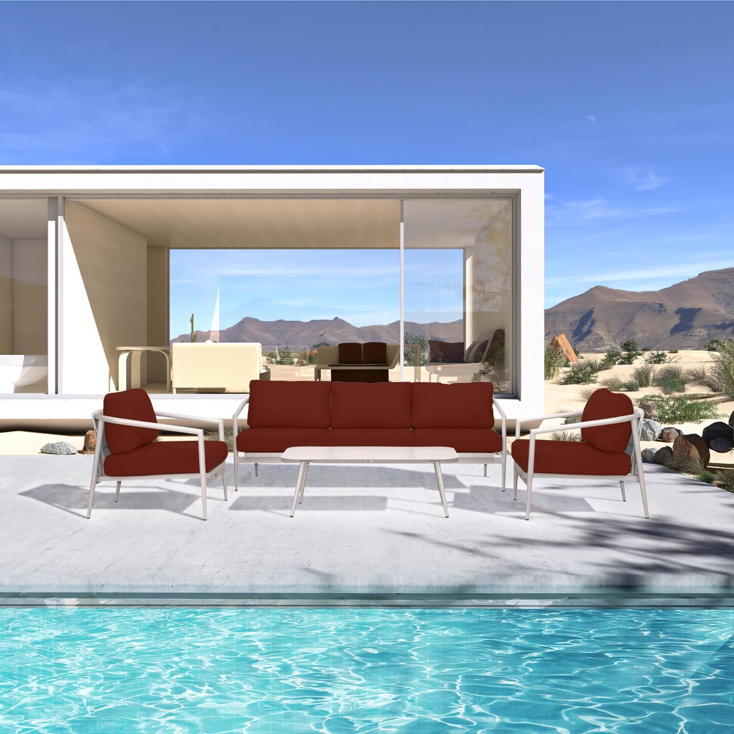 The Midnight Cove 4 Piece Sofa Set in an Urban Stone finish with Canvas Henna cushions is an imagined Mid Century Modern design brought to life with Carrera Olefin rope. Accented with tapered legs, subtle curves and an intertwining roped back for flair, the silhouette of the Midnight Cove collection is a sophisticated work of art. Midnight Cove was efficiently designed to be both compact in its footprint while still offering full sized deep seating comfort. Its fully-welded aluminum frames are treated with a powder-coated finish to ensure lasting performance across the seasons. Beautiful Carrera Olefin rope compliment the frames making it both visually appealing and durable in all types of climates. The cushions are made in the USA with quick-drying, Dacron and UV-treated, marine-grade PremoBond thread to create a supportive, yet comfortable seat that is meant to last throughout the seasons. All cushions are constructed from Sunbrella performance fabrics, which carry a 5-year fade warranty. This piece is offered in 9 popular Sunbrella fabric options which are fade resistant, easy to clean, and ready to ship within days of placing an order! The sleek, aluminum table perfectly compliments the rest of the deep seating set!