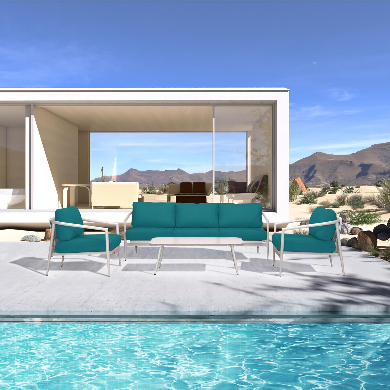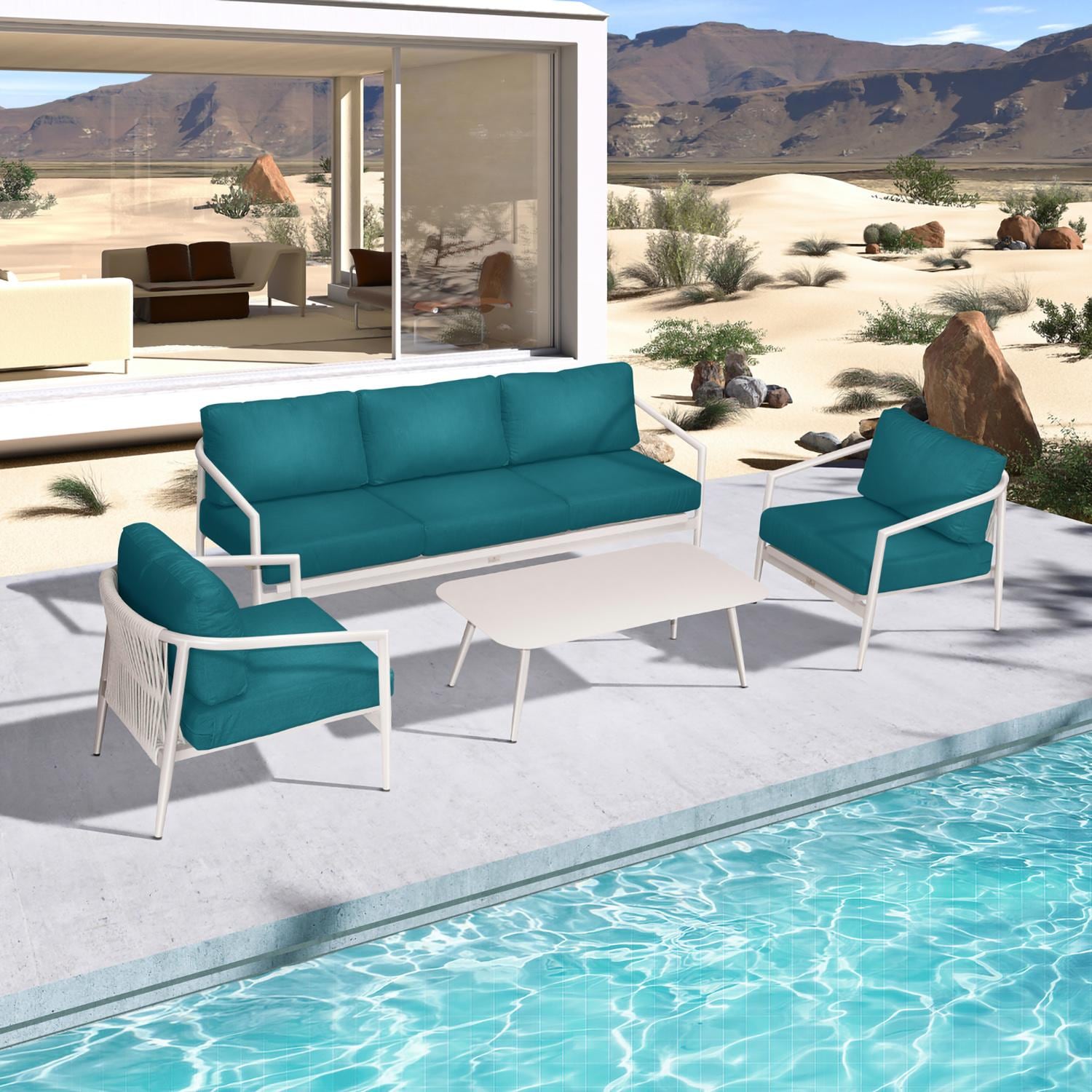 The Midnight Cove 4 Piece Sofa Set in an Urban Stone finish with Spectrum Peacock cushions is an imagined Mid Century Modern design brought to life with Carrera Olefin rope. Accented with tapered legs, subtle curves and an intertwining roped back for flair, the silhouette of the Midnight Cove collection is a sophisticated work of art. Midnight Cove was efficiently designed to be both compact in its footprint while still offering full sized deep seating comfort. Its fully-welded aluminum frames are treated with a powder-coated finish to ensure lasting performance across the seasons. Beautiful Carrera Olefin rope compliment the frames making it both visually appealing and durable in all types of climates. The cushions are made in the USA with quick-drying, Dacron and UV-treated, marine-grade PremoBond thread to create a supportive, yet comfortable seat that is meant to last throughout the seasons. All cushions are constructed from Sunbrella performance fabrics, which carry a 5-year fade warranty. This piece is offered in 9 popular Sunbrella fabric options which are fade resistant, easy to clean, and ready to ship within days of placing an order! The sleek, aluminum table perfectly compliments the rest of the deep seating set!