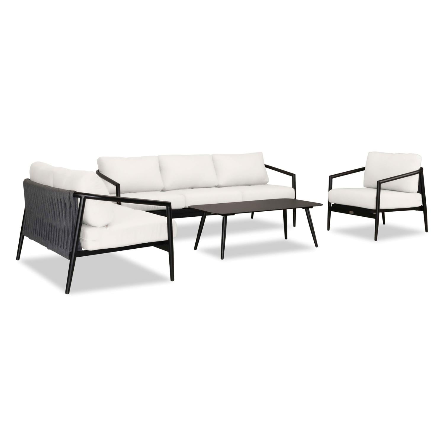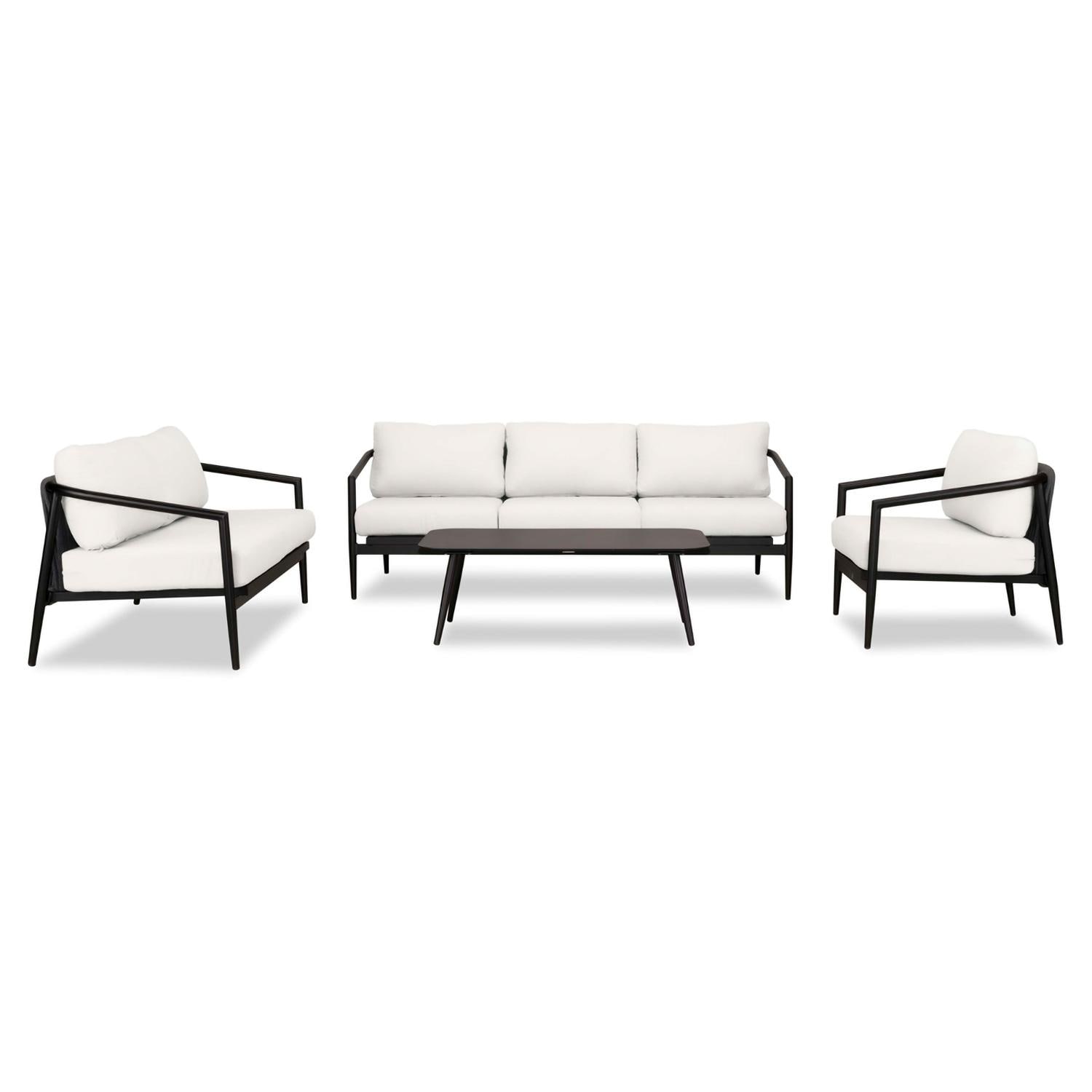 The Midnight Cove 4 Piece Sofa Loveseat Set in a Black finish with Canvas Natural cushions is an imagined Mid Century Modern design brought to life with Carbon Olefin rope. Accented with tapered legs, subtle curves and an intertwining roped back for flair, the silhouette of the Midnight Cove collection is a sophisticated work of art. Midnight Cove was efficiently designed to be both compact in its footprint while still offering full sized deep seating comfort. Its fully-welded aluminum frames are treated with a powder-coated finish to ensure lasting performance across the seasons. Beautiful Carbon Olefin rope compliment the frames making it both visually appealing and durable in all types of climates. The cushions are made in the USA with quick-drying, Dacron and UV-treated, marine-grade PremoBond thread to create a supportive, yet comfortable seat that is meant to last throughout the seasons. All cushions are constructed from Sunbrella performance fabrics, which carry a 5-year fade warranty. This piece is offered in 9 popular Sunbrella fabric options which are fade resistant, easy to clean, and ready to ship within days of placing an order! The sleek, aluminum table perfectly compliments the rest of the deep seating set!