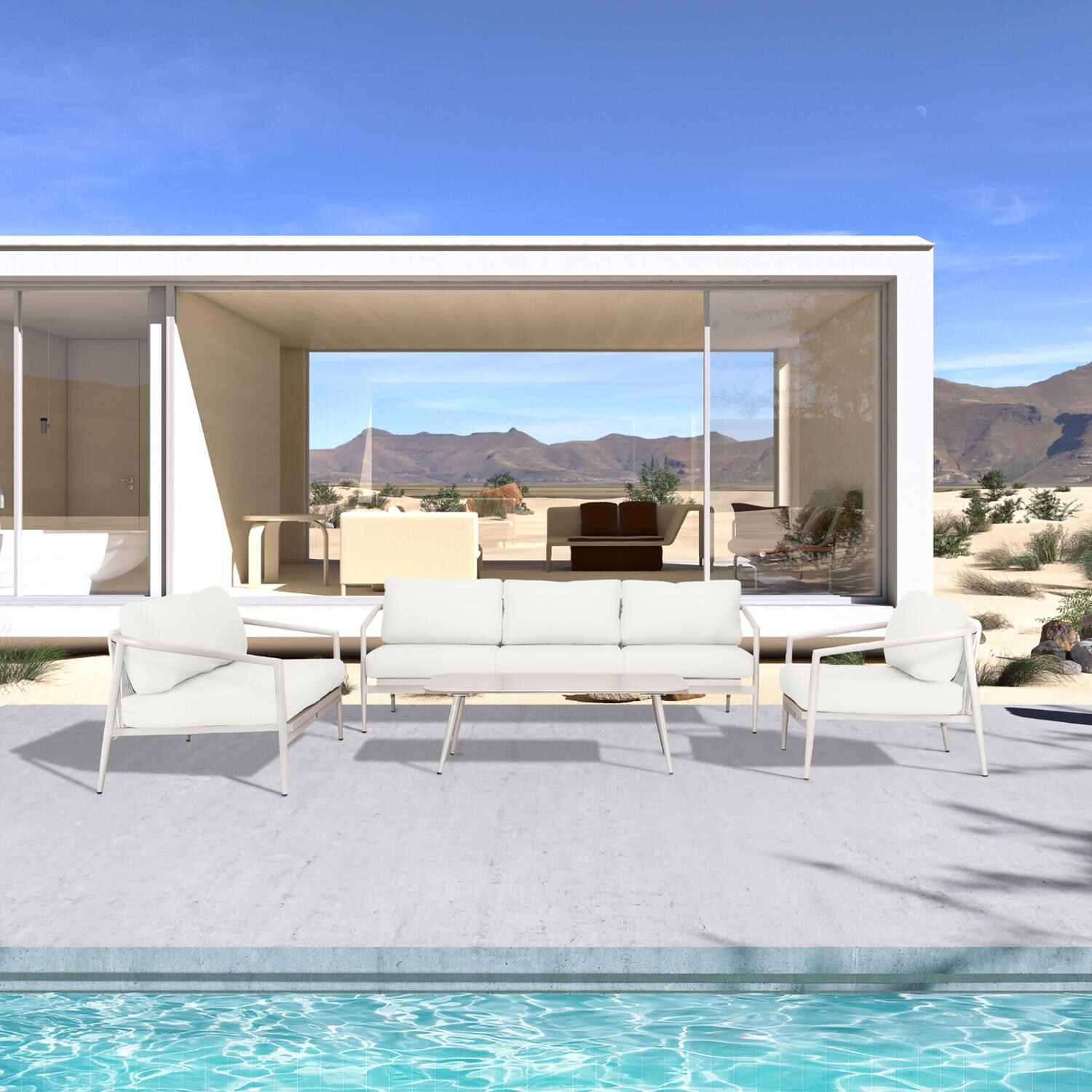 The Midnight Cove 4 Piece Sofa Loveseat Set in an Urban Stone finish with Canvas Natural cushions is an imagined Mid Century Modern design brought to life with Carrera Olefin rope. Accented with tapered legs, subtle curves and an intertwining roped back for flair, the silhouette of the Midnight Cove collection is a sophisticated work of art. Midnight Cove was efficiently designed to be both compact in its footprint while still offering full sized deep seating comfort. Its fully-welded aluminum frames are treated with a powder-coated finish to ensure lasting performance across the seasons. Beautiful Carrera Olefin rope compliment the frames making it both visually appealing and durable in all types of climates. The cushions are made in the USA with quick-drying, Dacron and UV-treated, marine-grade PremoBond thread to create a supportive, yet comfortable seat that is meant to last throughout the seasons. All cushions are constructed from Sunbrella performance fabrics, which carry a 5-year fade warranty. This piece is offered in 9 popular Sunbrella fabric options which are fade resistant, easy to clean, and ready to ship within days of placing an order! The sleek, aluminum table perfectly compliments the rest of the deep seating set!