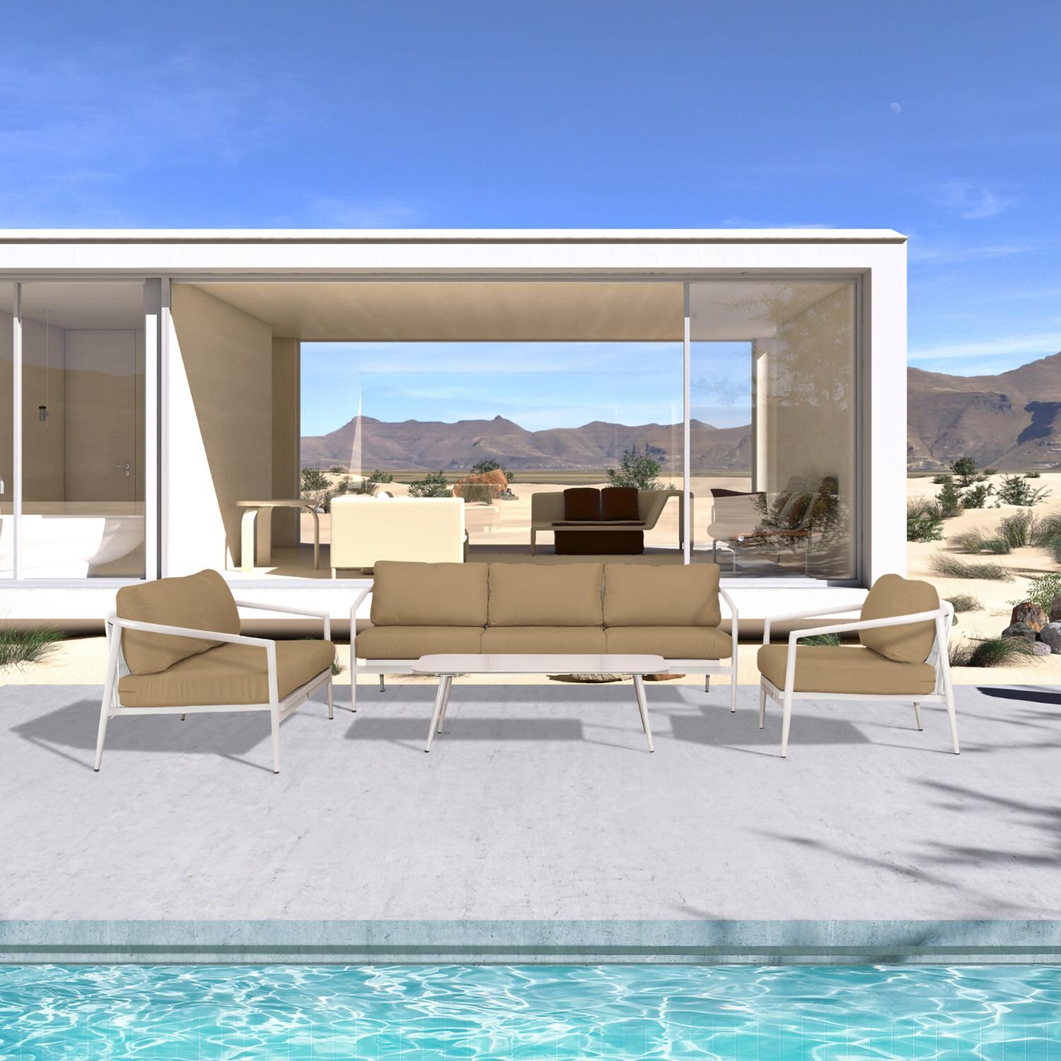 The Midnight Cove 4 Piece Sofa Loveseat Set in an Urban Stone finish with Heather Beige cushions is an imagined Mid Century Modern design brought to life with Carrera Olefin rope. Accented with tapered legs, subtle curves and an intertwining roped back for flair, the silhouette of the Midnight Cove collection is a sophisticated work of art. Midnight Cove was efficiently designed to be both compact in its footprint while still offering full sized deep seating comfort. Its fully-welded aluminum frames are treated with a powder-coated finish to ensure lasting performance across the seasons. Beautiful Carrera Olefin rope compliment the frames making it both visually appealing and durable in all types of climates. The cushions are made in the USA with quick-drying, Dacron and UV-treated, marine-grade PremoBond thread to create a supportive, yet comfortable seat that is meant to last throughout the seasons. All cushions are constructed from Sunbrella performance fabrics, which carry a 5-year fade warranty. This piece is offered in 9 popular Sunbrella fabric options which are fade resistant, easy to clean, and ready to ship within days of placing an order! The sleek, aluminum table perfectly compliments the rest of the deep seating set!
