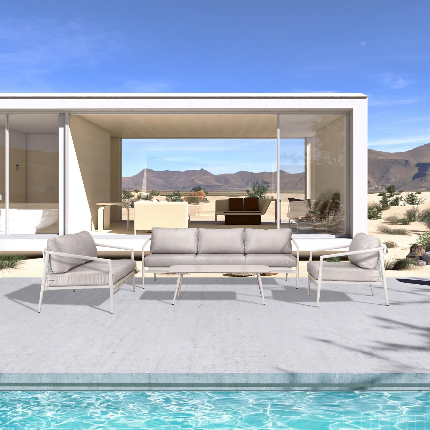 The Midnight Cove 4 Piece Sofa Loveseat Set in an Urban Stone finish with Spectrum Indigo cushions is an imagined Mid Century Modern design brought to life with Carrera Olefin rope. Accented with tapered legs, subtle curves and an intertwining roped back for flair, the silhouette of the Midnight Cove collection is a sophisticated work of art. Midnight Cove was efficiently designed to be both compact in its footprint while still offering full sized deep seating comfort. Its fully-welded aluminum frames are treated with a powder-coated finish to ensure lasting performance across the seasons. Beautiful Carrera Olefin rope compliment the frames making it both visually appealing and durable in all types of climates. The cushions are made in the USA with quick-drying, Dacron and UV-treated, marine-grade PremoBond thread to create a supportive, yet comfortable seat that is meant to last throughout the seasons. All cushions are constructed from Sunbrella performance fabrics, which carry a 5-year fade warranty. This piece is offered in 9 popular Sunbrella fabric options which are fade resistant, easy to clean, and ready to ship within days of placing an order! The sleek, aluminum table perfectly compliments the rest of the deep seating set!