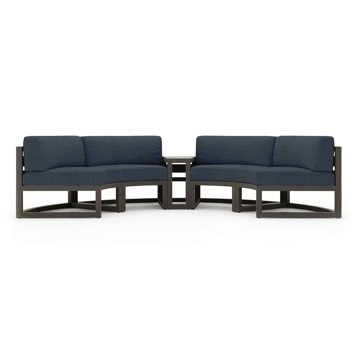 The Misty Cove 3 Piece Curve Sectional Set - Slate - Spectrum Indigo brings artful design to your outdoor space. Sit back and relax with a collection that is both stylish and comfortable with its sleek silhouette and extra-spacious deep seating. Its fully-welded aluminum frames are treated with a powder-coated finish to ensure lasting performance across the seasons. The cushions are made in the USA with quick-drying, Dacron and UV-treated, marine-grade PremoBond thread to create a supportive, yet comfortable seat that is meant to last throughout the seasons. All cushions are constructed from Sunbrella performance fabrics, which carry a 5-year fade warranty. This piece is offered in 9 popular Sunbrella fabric options which are fade resistant, easy to clean, and ready to ship within days of placing an order! The Misty Cove Table offers a stylish design its sleek, metal-work silhouette and slatted table top.