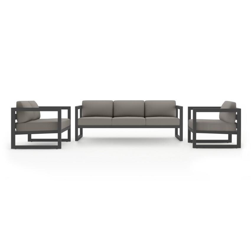 The Misty Cove 3 Piece Sofa Loveseat - Slate - Canvas Charcoal brings artful design to your outdoor space. Sit back and relax with a collection that is both stylish and comfortable with its sleek silhouette and extra-spacious deep seating. Its fully-welded aluminum frames are treated with a powder-coated finish to ensure lasting performance across the seasons. The cushions are made in the USA with quick-drying, Dacron and UV-treated, marine-grade PremoBond thread to create a supportive, yet comfortable seat that is meant to last throughout the seasons. All cushions are constructed from Sunbrella performance fabrics, which carry a 5-year fade warranty. This piece is offered in 9 popular Sunbrella fabric options which are fade resistant, easy to clean, and ready to ship within days of placing an order!