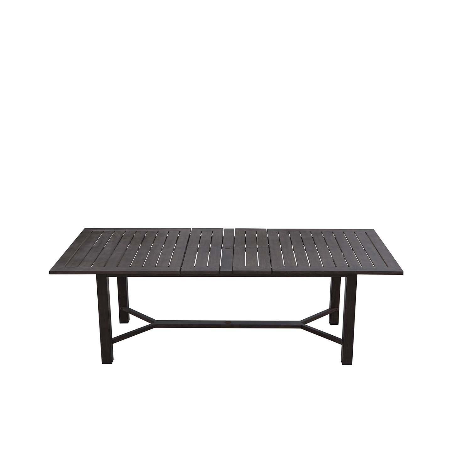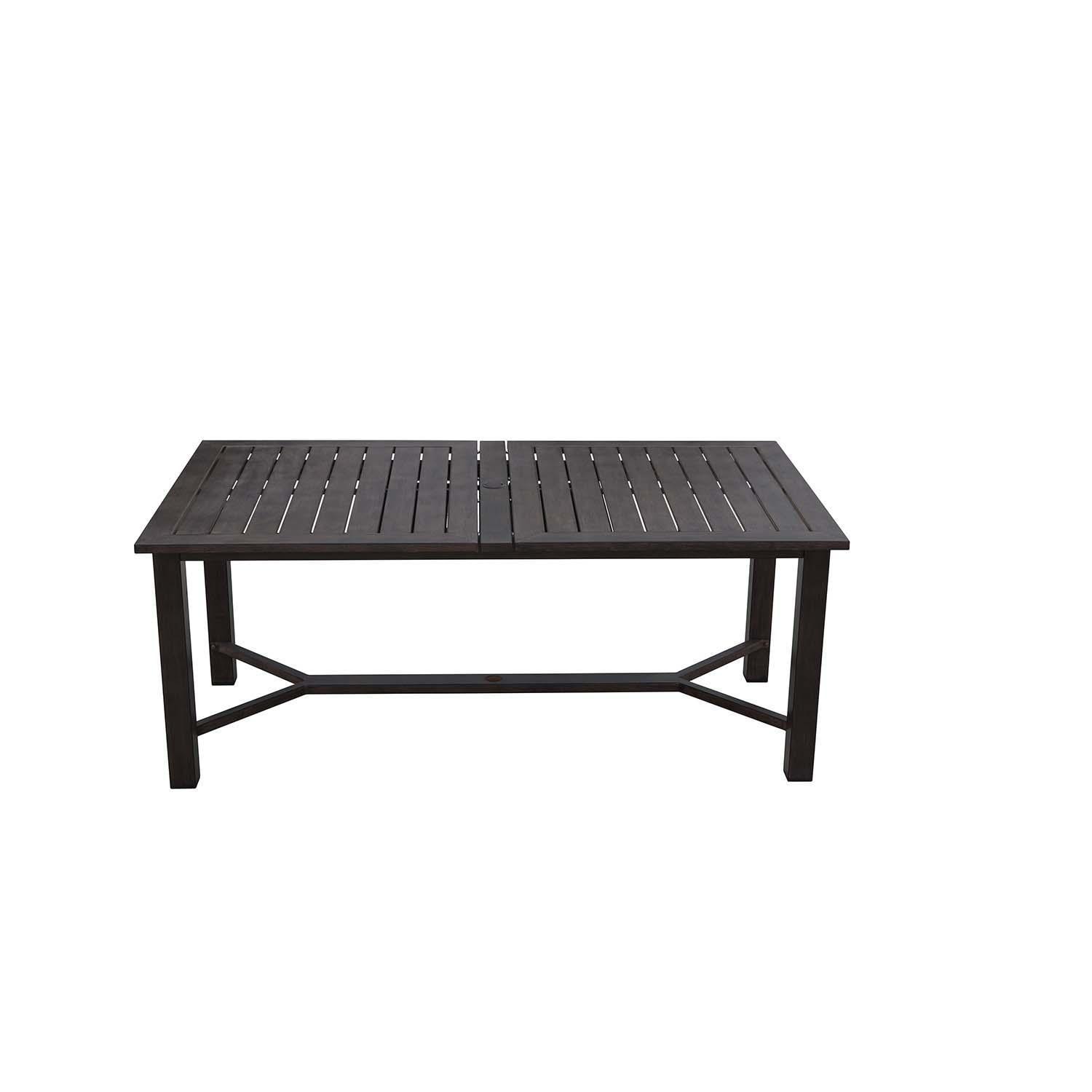 The Atlantis Collection Dining Set is a versatile and stylish addition to your outdoor dining space. The set includes eight side chairs for a comfortable seating experience, while the sleek, modern design adds a touch of sophistication to your patio or garden. Crafted from durable never rust aluminum with a hand brushed walnut wood-like texture. The middle of the table conveniently collapses to adjust seating capacity, allowing for dynamic arrangements and saving space when needed. Enjoy meals in style with the Atlantis collection. To ensure a proper fit, please double-check the height and diameter of your umbrella base flange. The umbrella hole at the table's base is 1-7/8 inches, which may not be compatible with all umbrella bases. Cantilever style umbrellas provide shade without using the umbrella hole and may be an option.
