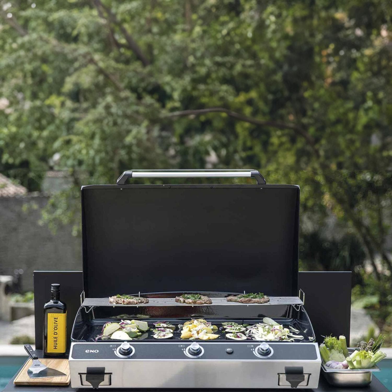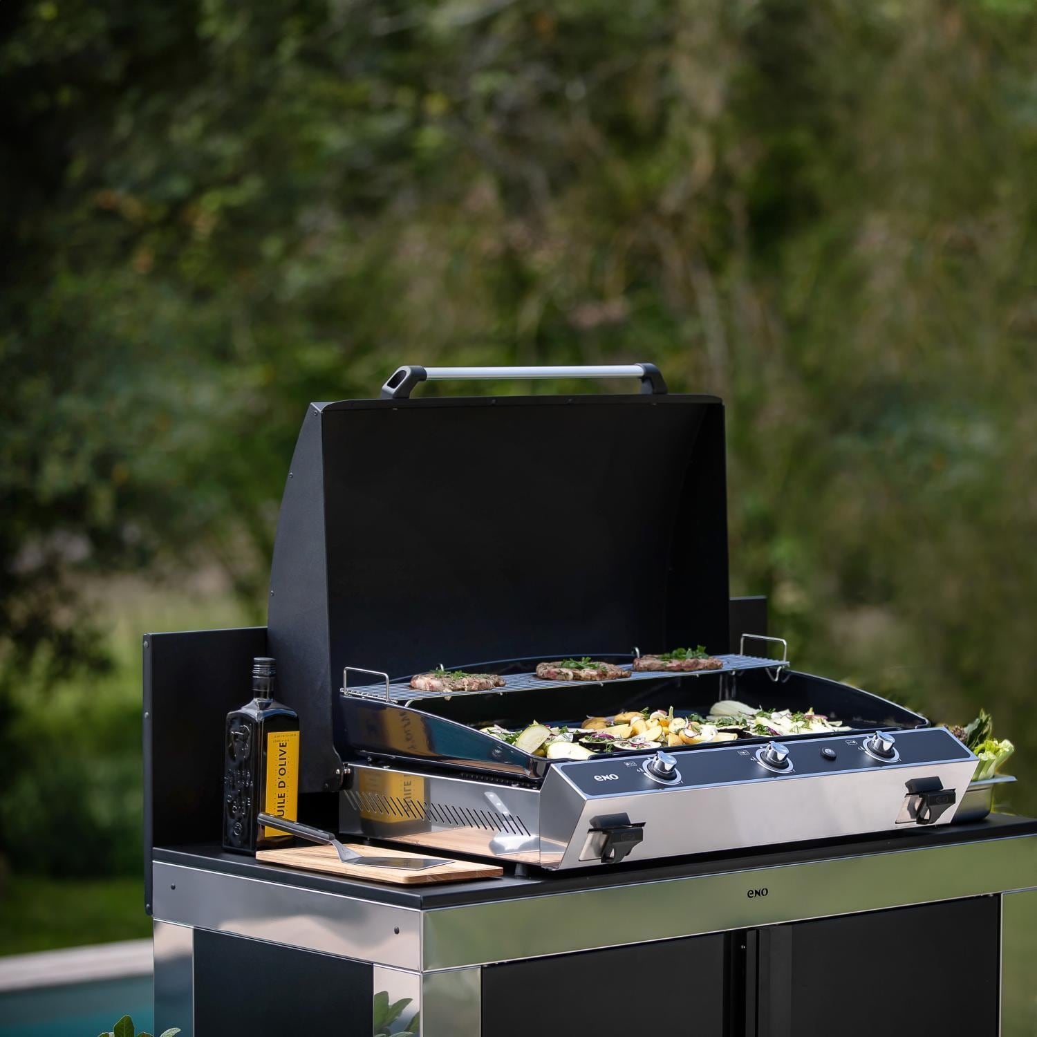 The ENO Gas Plancha provides a unique blend of convenience, expanded culinary flexibility and easy clean up. This 3-cooking zone Plancha is designed for outdoor use, constructed with Marine Grade Stainless Steel. The multi-layer cast enameled plate provides 435 square inches of even, high heat (680F) non-stick cooking surface that is easy to clean. The Enameled plate comes with a lifetime warranty. Safety is first in mind with thermocouple protected burners and no open flame for flare ups. It has the added convenience of Electronic Ignition, 2 integrated drip trays and adjustable feet. There simply is no better way to cook outdoors. It is more than just a griddle, it is a PLANCHA. Lid not included.