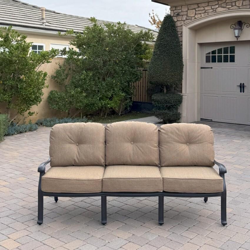 The Santa Anita Collection by Darlee puts the focus on comfort, conversation, and celebrating your life every day. With a focus on deep seating conversation sets and dining options that seat up to ten with ease, the Santa Anita Collection creates the perfect setting to welcome your next gathering. The collection has a simple design featuring curved arms seating and an elegant back scroll pattern. The entire collection is set in cast aluminum and finished in an Antique Bronze color that is powder coated. This provides extra protection against the elements, is rust resistant, and will help your furniture last longer. The cast aluminum frames are accessorized with polyester cushions in the color Sesame. A variety of dining sets are offered in this collection, ranging from 4 person accommodations to 10 person accommodations. Dining tables offered include a 48 inch round, 71 inch round, 72 X 42 inch, 92 X 42 inch rectangular, and 64 inch square. The 92 X 42 inch rectangular table is extendable, perfect for large gatherings. Dining chairs for this collection are available in both standard and swivel. This collection also includes propane fire pit dining tables which adds a touch of elegance to any space.