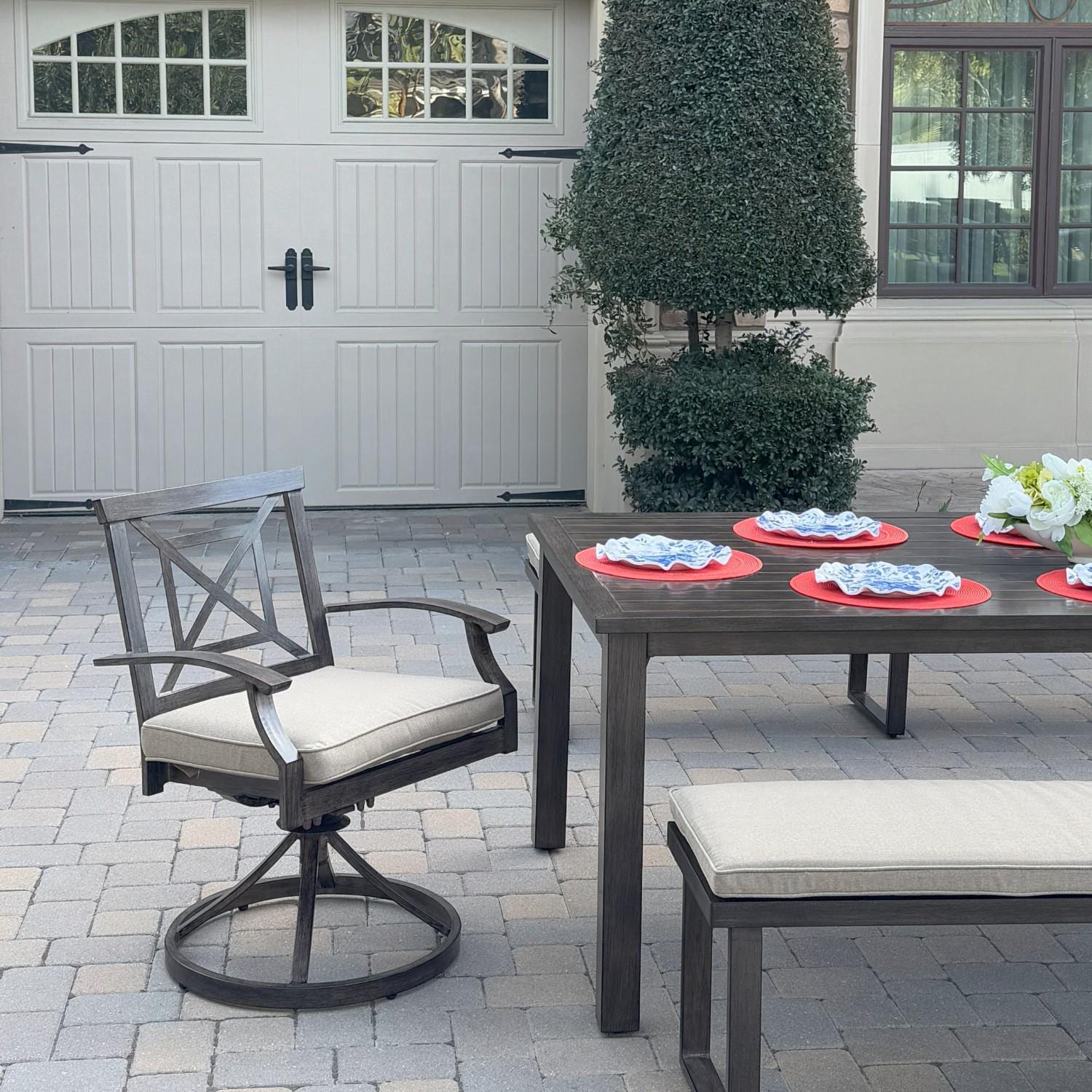 - Set Includes: 2 Swivel Rocker Chairs, 2 Three Person Bench, Cushions, and a Rectangular Dining Table