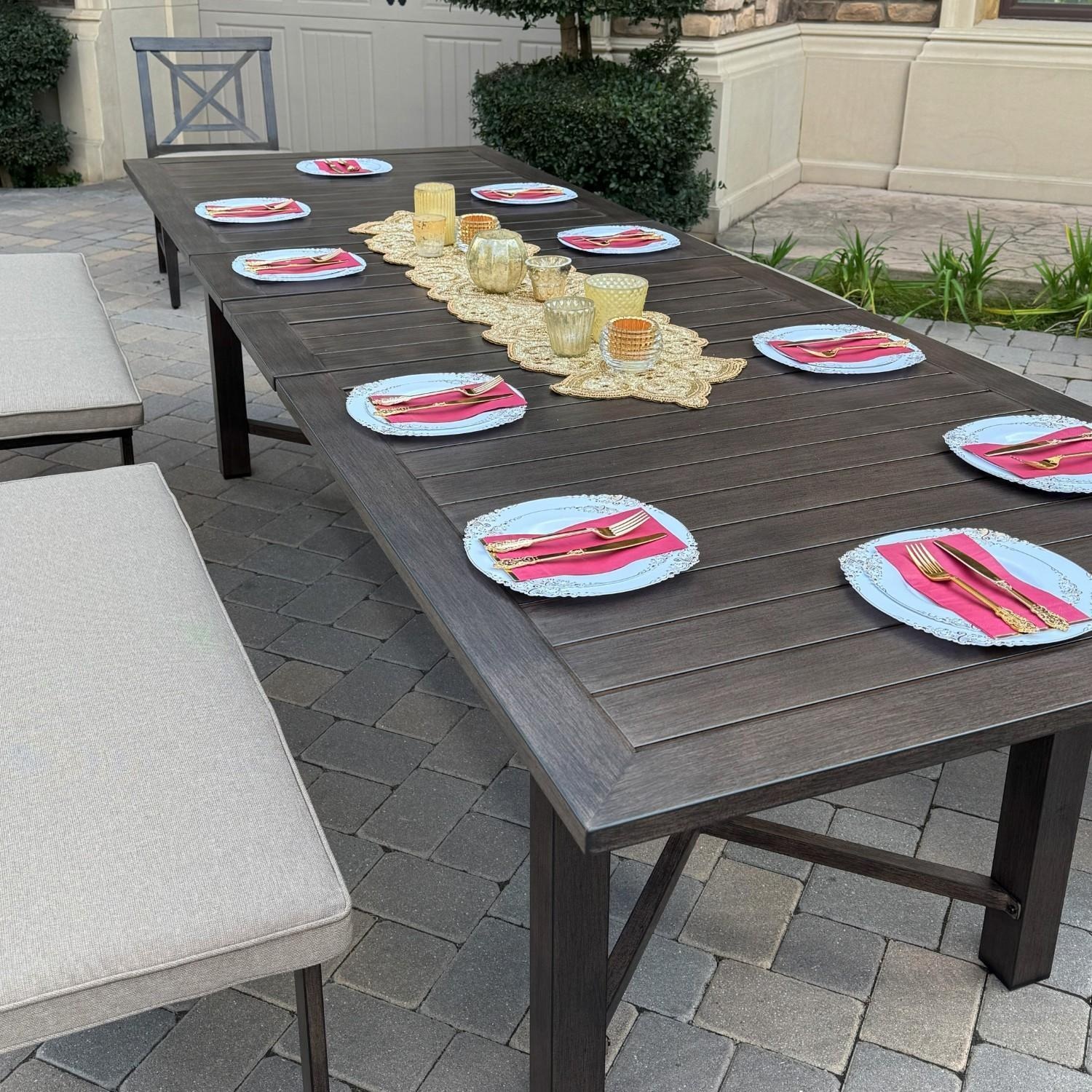 Enhance your dining experience with this chic and sophisticated large dining set in Beige. Perfect for formal gatherings. Crafted from rust-resistant aluminum with an elegant imitation walnut wood finish. The retractable tabletop offers two size options-91 inches X 40 inches and 118 inches X 40 inches-allowing flexibility for different occasions. Extension dining table features a butterfly-style extension mechanism that allows effortless expansion to accommodate more guests. The built-in storage for the extension piece keeps your space clutter-free while ensuring easy access when needed. The park bench-style dining chairs create a relaxed and inviting atmosphere, featuring a space-saving. The armless dining chair provides more flexibility in movement and a relaxed seating experience. Upgrade your space today with this exquisite design. To ensure a proper fit, please double-check the height and diameter of your umbrella base flange. The umbrella hole at the table's base is 1-7/8 inches, which may not be compatible with all umbrella bases. Cantilever style umbrellas provide shade without using the umbrella hole and may be an option.