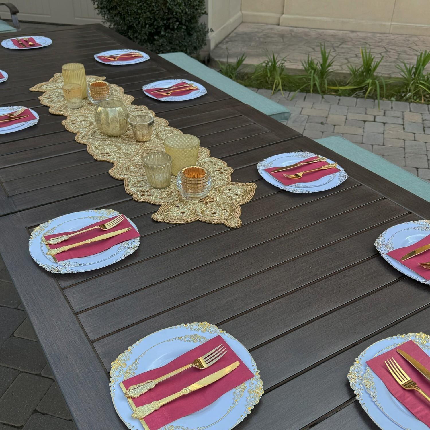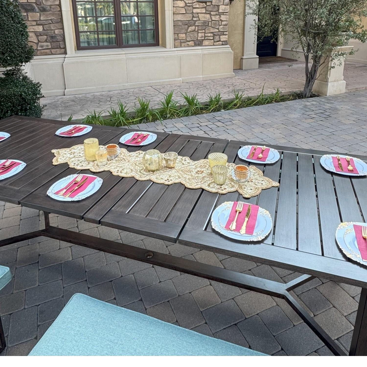 Enhance your dining experience with this chic and sophisticated large dining set in Spa. Perfect for formal gatherings. Crafted from rust-resistant aluminum with an elegant imitation walnut wood finish. The retractable tabletop offers two size options-91 inches X 40 inches and 118 inches X 40 inches-allowing flexibility for different occasions. Extension dining table features a butterfly-style extension mechanism that allows effortless expansion to accommodate more guests. The built-in storage for the extension piece keeps your space clutter-free while ensuring easy access when needed. The park bench-style dining chairs create a relaxed and inviting atmosphere, featuring a space-saving. The swivel rocker dining chair 360-degree smooth swivel and gentle rocking motion add a relaxing touch, making outdoor meals or casual lounging even more enjoyable. Upgrade your space today with this exquisite design. To ensure a proper fit, please double-check the height and diameter of your umbrella base flange. The umbrella hole at the table's base is 1-7/8 inches, which may not be compatible with all umbrella bases. Cantilever style umbrellas provide shade without using the umbrella hole and may be an option.