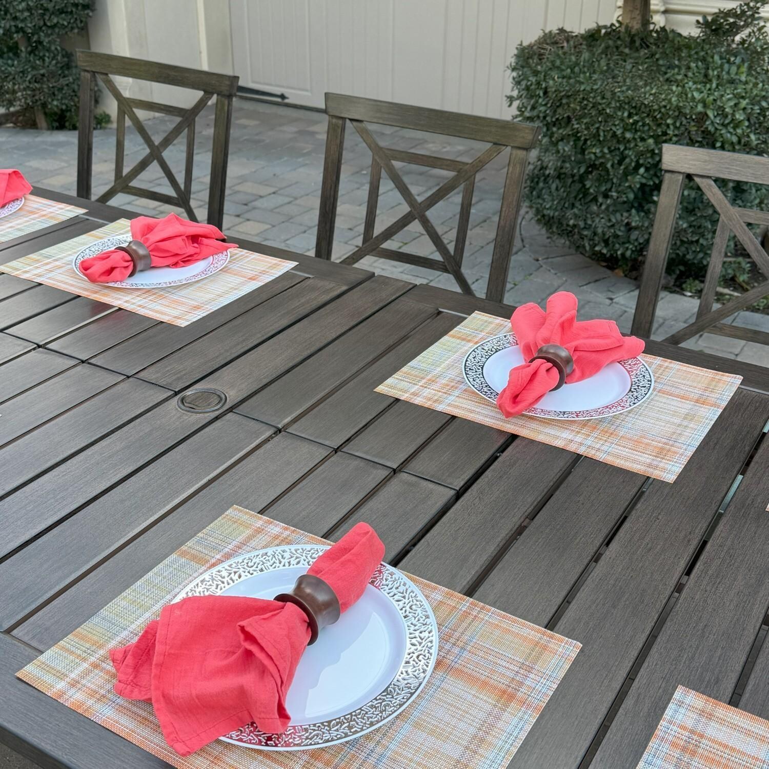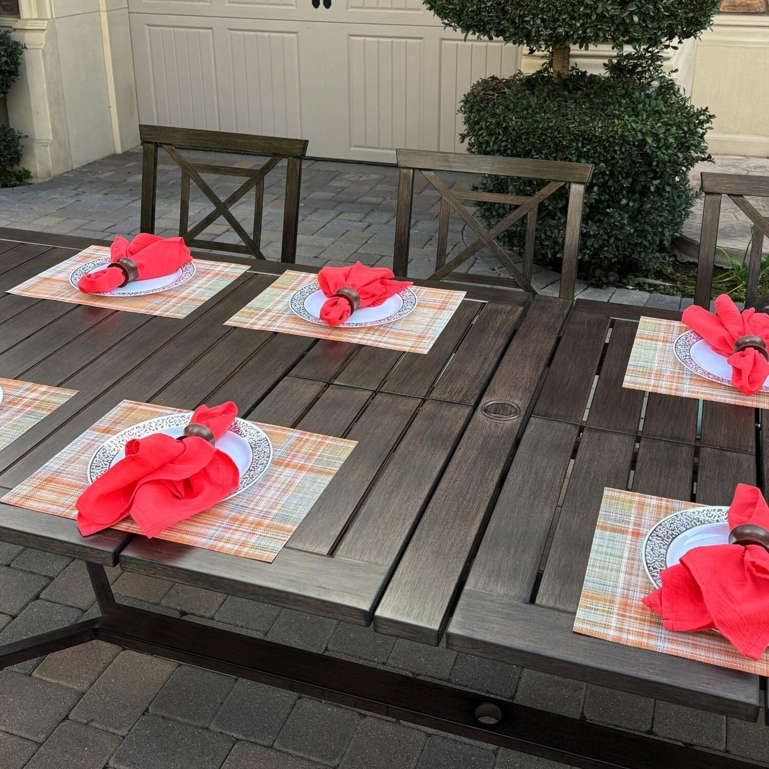Enhance your dining experience with this chic and sophisticated large dining set in Spa. Perfect for formal gatherings. Crafted from rust-resistant aluminum with an elegant imitation walnut wood finish. The retractable tabletop offers two size options-91 inches X 40 inches and 118 inches X 40 inches-allowing flexibility for different occasions. Extension dining table features a butterfly-style extension mechanism that allows effortless expansion to accommodate more guests. The built-in storage for the extension piece keeps your space clutter-free while ensuring easy access when needed. The park bench-style dining chairs create a relaxed and inviting atmosphere, featuring a space-saving. The armless dining chair provides more flexibility in movement and a relaxed seating experience. The swivel rocker dining chair 360-degree smooth swivel and gentle rocking motion add a relaxing touch, making outdoor meals or casual lounging even more enjoyable. Upgrade your space today with this exquisite design. To ensure a proper fit, please double-check the height and diameter of your umbrella base flange. The umbrella hole at the table's base is 1-7/8 inches, which may not be compatible with all umbrella bases. Cantilever style umbrellas provide shade without using the umbrella hole and may be an option.