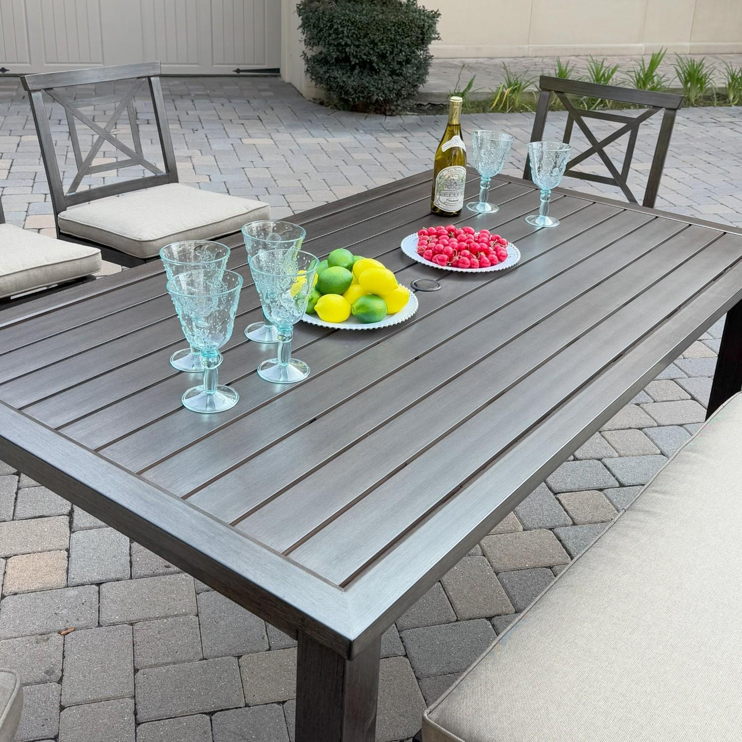 Darlee Atlantis 6-Piece Dining Set in beige create a relaxed and comfortable atmosphere in your outdoor space. Crafted from rust-resistant aluminum with an elegant imitation walnut wood finish. The large one-piece 70 inch X 41.7 inch rectangular table top has a built-in umbrella hole. The flat tabletop design can accommodate wine glasses of any size without worrying about tipping over. The park bench-style dining chairs create a relaxed and inviting atmosphere, featuring a space-saving. The armless dining chair provides more flexibility in movement and a relaxed seating experience. Combining style, functionality, and comfort, this set is the perfect addition to any outdoor setting.