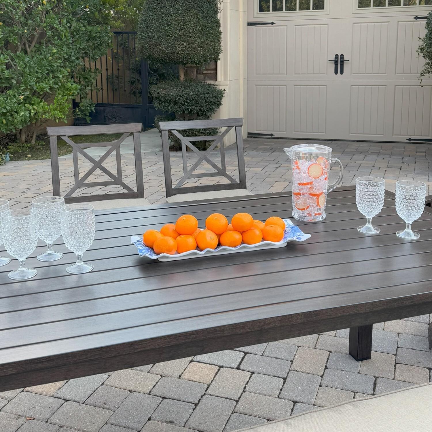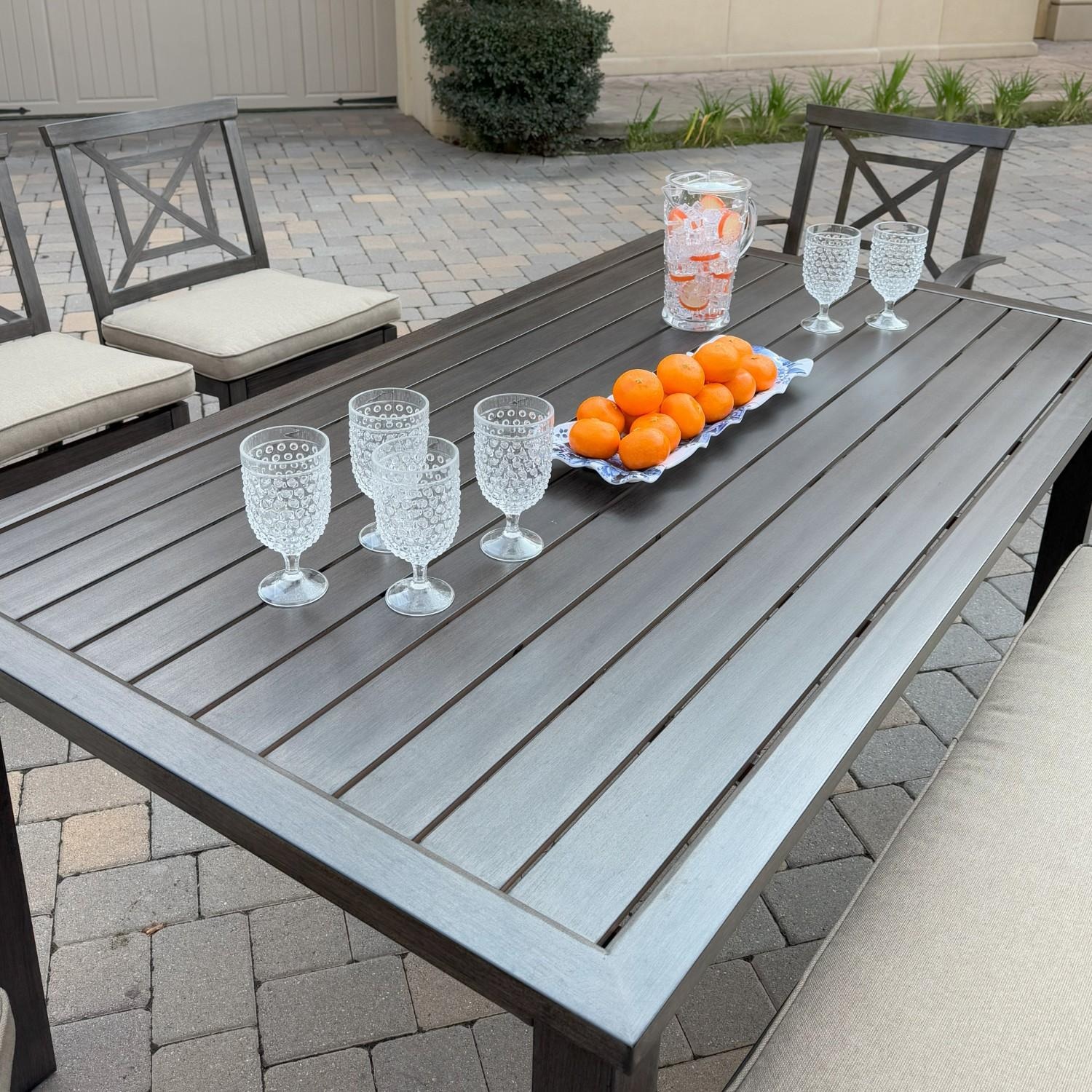 Darlee Atlantis 6-Piece Dining Set in beige create a relaxed and comfortable atmosphere in your outdoor space. Crafted from rust-resistant aluminum with an elegant imitation walnut wood finish. The large one-piece 70 inch X 41.7 inch rectangular table top has a built-in umbrella hole. The flat tabletop design can accommodate wine glasses of any size without worrying about tipping over. The park bench-style dining chairs create a relaxed and inviting atmosphere, featuring a space-saving. The armless dining chair provides more flexibility in movement and a relaxed seating experience. The swivel rocker dining chair 360-degree smooth swivel and gentle rocking motion add a relaxing touch, making outdoor meals or casual lounging even more enjoyable. Combining style, functionality, and comfort, this set is the perfect addition to any outdoor setting.