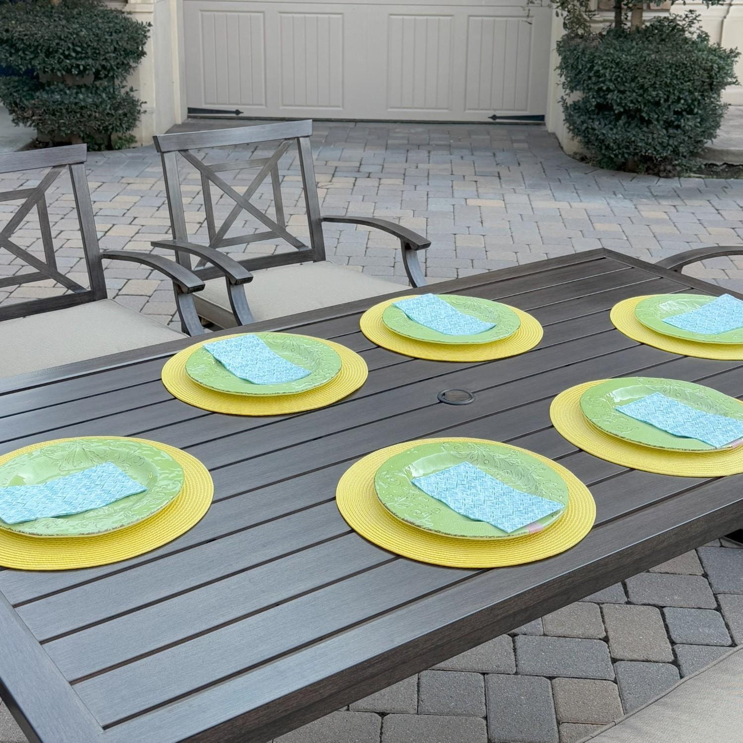 Darlee Atlantis 6-Piece Dining Set in beige create a relaxed and comfortable atmosphere in your outdoor space. Crafted from rust-resistant aluminum with an elegant imitation walnut wood finish. The large one-piece 70 inch X 41.7 inch rectangular table top has a built-in umbrella hole. The flat tabletop design can accommodate wine glasses of any size without worrying about tipping over. The park bench-style dining chairs create a relaxed and inviting atmosphere, featuring a space-saving. The swivel rocker dining chair 360-degree smooth swivel and gentle rocking motion add a relaxing touch, making outdoor meals or casual lounging even more enjoyable. Combining style, functionality, and comfort, this set is the perfect addition to any outdoor setting.