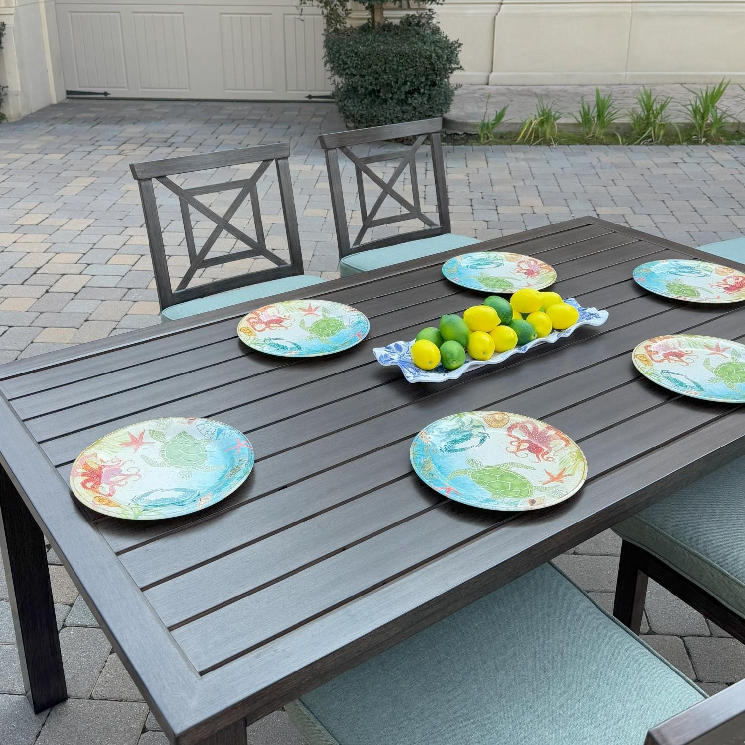 Darlee Atlantis 7-Piece Dining Set in spa create a relaxed and comfortable atmosphere in your outdoor space. Crafted from rust-resistant aluminum with an elegant imitation walnut wood finish. The large one-piece 70 inch X 41.7 inch rectangular table top has a built-in umbrella hole. The flat tabletop design can accommodate wine glasses of any size without worrying about tipping over. The armless dining chair provides more flexibility in movement and a relaxed seating experience. Combining style, functionality, and comfort, this set is the perfect addition to any outdoor setting.