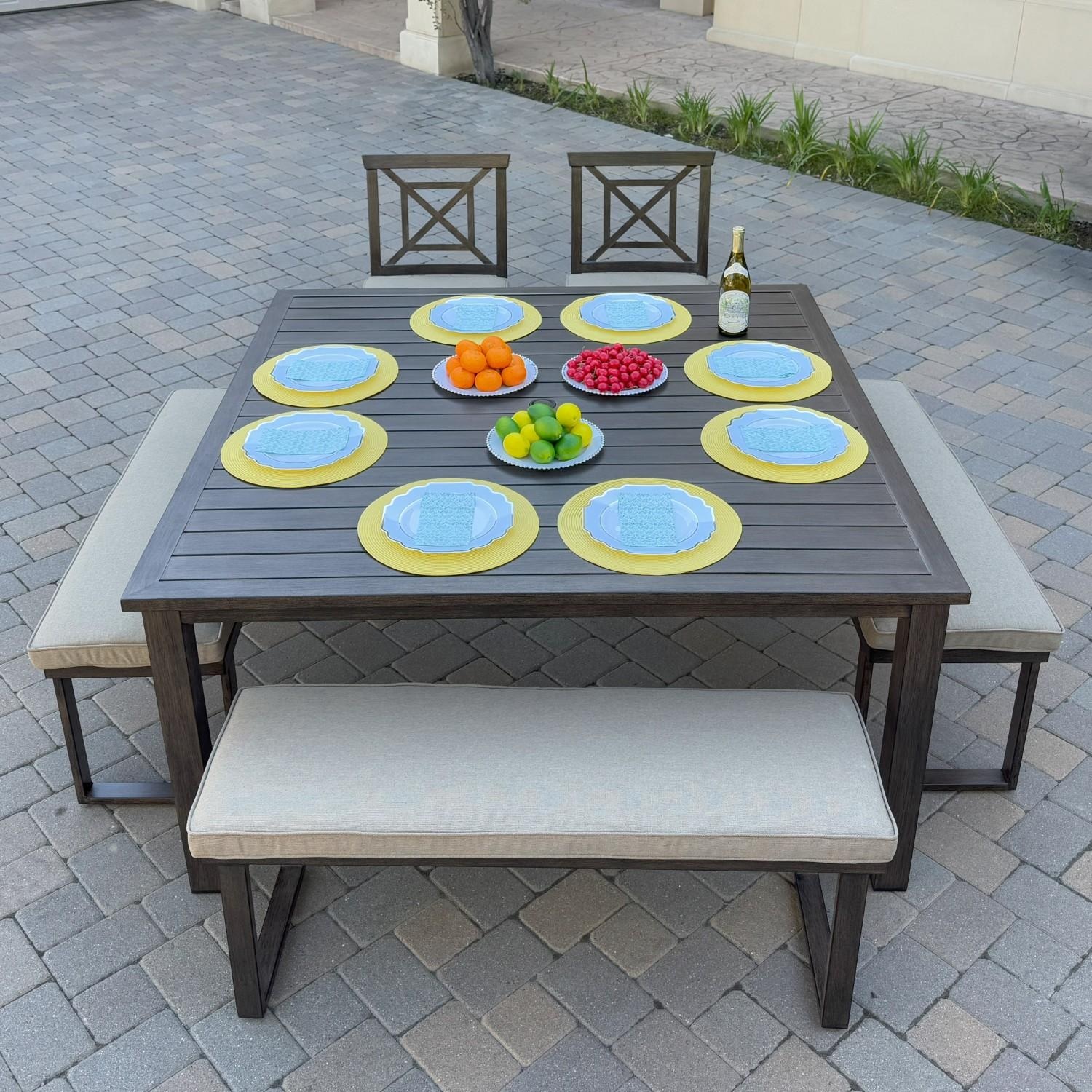 - Set Includes: 2 Dining Chairs, 3 Two Person Benches, Cushions, and a Square Dining Table
