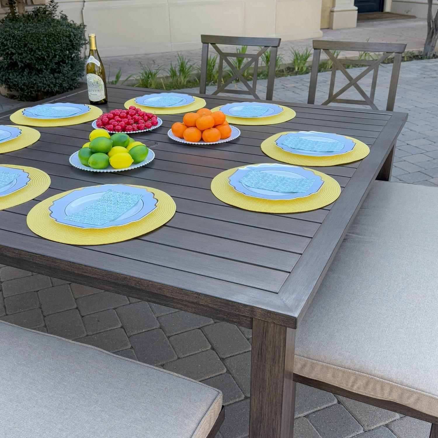 Darlee Atlantis 6-Piece Dining Set in beige create a relaxed and comfortable atmosphere in your outdoor space. Crafted from rust-resistant aluminum with an elegant imitation walnut wood finish. The one-piece 61.5 inch square table top ensures easy installation, while the square dining table comfortably accommodates up to eight guests without taking up excessive space. The park bench-style dining chairs create a relaxed and inviting atmosphere, featuring a space-saving. The armless dining chair provides more flexibility in movement and a relaxed seating experience. Combining style, functionality, and comfort, this set is the perfect addition to any outdoor setting.