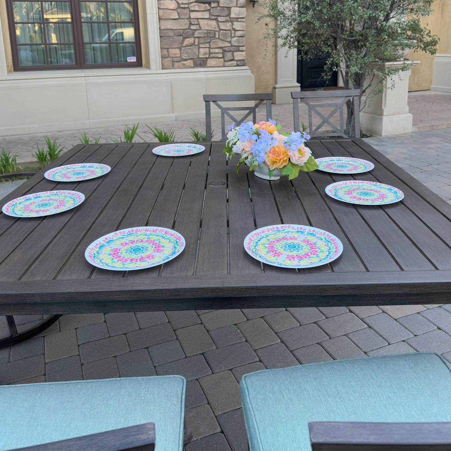 Darlee Atlantis 8-Piece Spa Dining Set in spa create a relaxed and comfortable atmosphere in your outdoor space. Crafted from rust-resistant aluminum with an elegant imitation walnut wood finish. The one-piece 61.5 inch square table top ensures easy installation, while the square dining table comfortably accommodates up to eight guests without taking up excessive space. The park bench-style dining chairs create a relaxed and inviting atmosphere, featuring a space-saving. The armless dining chair provides more flexibility in movement and a relaxed seating experience. The swivel rocker dining chair 360-degree smooth swivel and gentle rocking motion add a relaxing touch, making outdoor meals or casual lounging even more enjoyable. Combining style, functionality, and comfort, this set is the perfect addition to any outdoor setting.