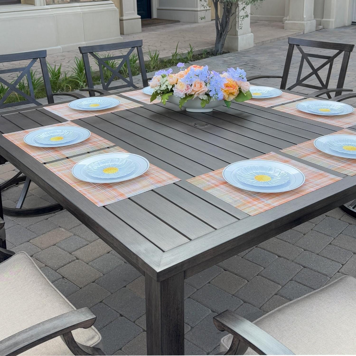 Darlee Atlantis 9-Piece Dining Set in beige create a relaxed and comfortable atmosphere in your outdoor space. Crafted from rust-resistant aluminum with an elegant imitation walnut wood finish. The one-piece 61.5 inch square table top ensures easy installation, while the square dining table comfortably accommodates up to eight guests without taking up excessive space. The swivel rocker dining chair 360-degree smooth swivel and gentle rocking motion add a relaxing touch, making outdoor meals or casual lounging even more enjoyable. Combining style, functionality, and comfort, this set is the perfect addition to any outdoor setting.