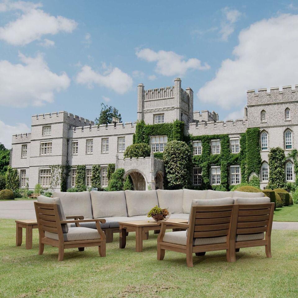 A modern classical design made from the best materials of premium grade teak, the Currier Bay Deep Seating Collection is the perfect conversation set for relaxing gatherings around your yard or patio. Made for quality, its considerable size and strong frame become apparently noticeable, complementing its stylish curve design from its armchair whorl to its tapered footed legs. Includes seating up to eight with one rectangular coffee and side table, perfect for placing your favorite book, tablet, or drink. Outdoor All-Weather Sunbrella cushions saturated with UV-stable pigments that resist color fade, water, mold, and mildew come included with your cushion option and color.