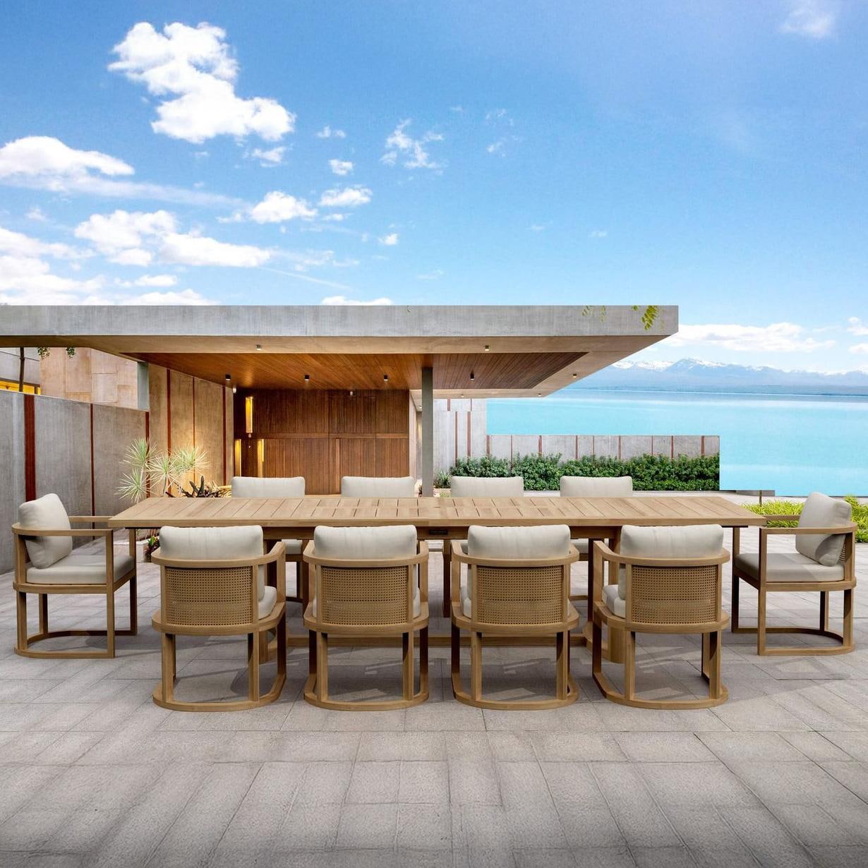 Seating up to 10 people, enjoy the comforts of outdoor dining with this spacious and luxurious Carondelet Extension Dining Table Set. Featuring one Carondelet Dining Extension Table with ten Carondelet Dining Armchairs with cushion, this set combines premium grade unfinished teak with synthetic wicker, the perfect materials for sustained outdoor use with little to no maintenance. The Carondelet Extension Dining Table is a sturdy and well-built solid teak outdoor dining table measuring 88 in length (closed) or 136 in length (fully extended) perfect for the home or yard. Simply slide open one or both extension leafs on either end to reveal two extra leafs in the middle for extra table space when needed, with umbrella hole in the middle and wooden plug when not in use. This set also includes 10 Carondelet Dining Armchairs expertly crafted and shaped to an exquisite round curve design. Chairs include 2 1/2 thick cushions from All-Weather Sunbrella Fabric and Pillow with your color option, ensuring a relaxing and most comfortable outdoor dining experience.
