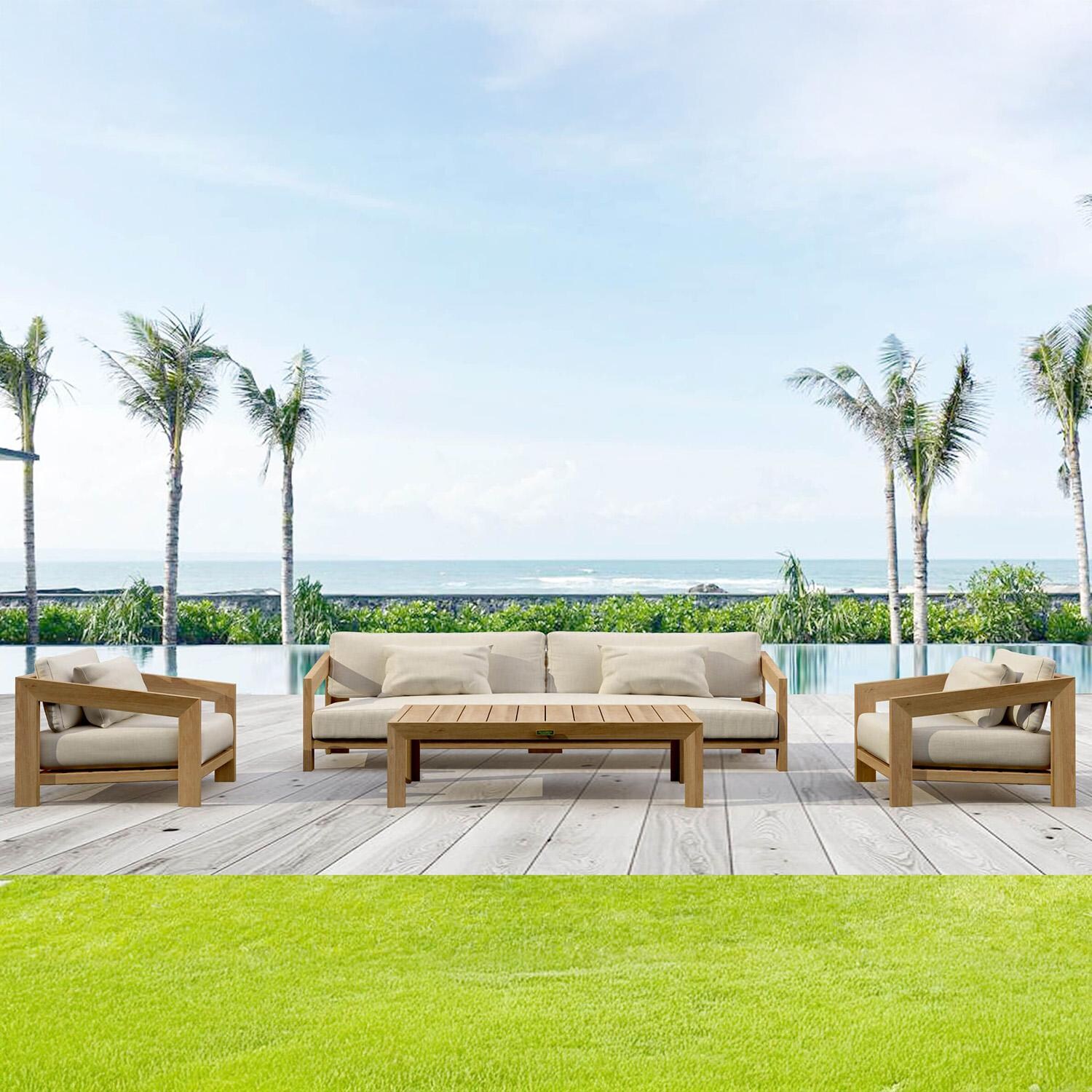An outdoor deep seating set made of premium quality teak; gather round with family and friends in the comfort of your home. Featuring the Avondale Loveseat, two Avondale Armchairs, one Swivel armchair and a matching Coffee Table, The Avondale Collection with its round curved design is sure to make any setting or decor pop. Includes 6 All-Weather Sunbrella cushions with choice of color and pattern option. Quality built to last.