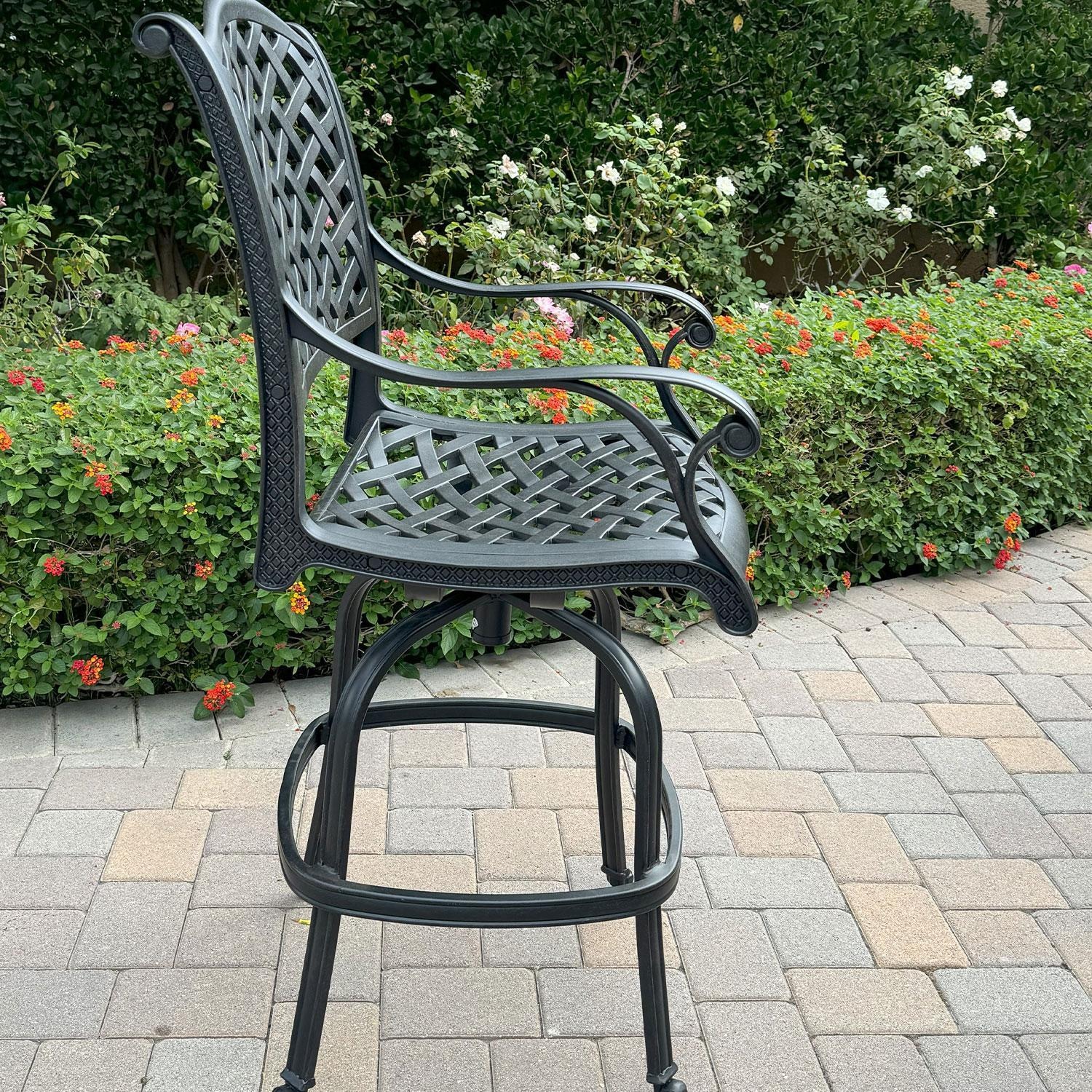 Wrap your guests in all the comforts represented by the Nassau collection. This outdoor patio swivel bar stool with red cushions features cast aluminum frame construction that is lighter in weight than wrought iron, and is rust resistant. The antique bronze frame is powder coated, making it tougher than conventional paint finishes. These Nassau bar stool cushions are crafted from polyester fabric, that is made to withstand the rigors of outdoor environments. Their design is tailored to coordinate seamlessly with the rest of the Nassau collection, ensuring both aesthetic harmony and of course, comfort.