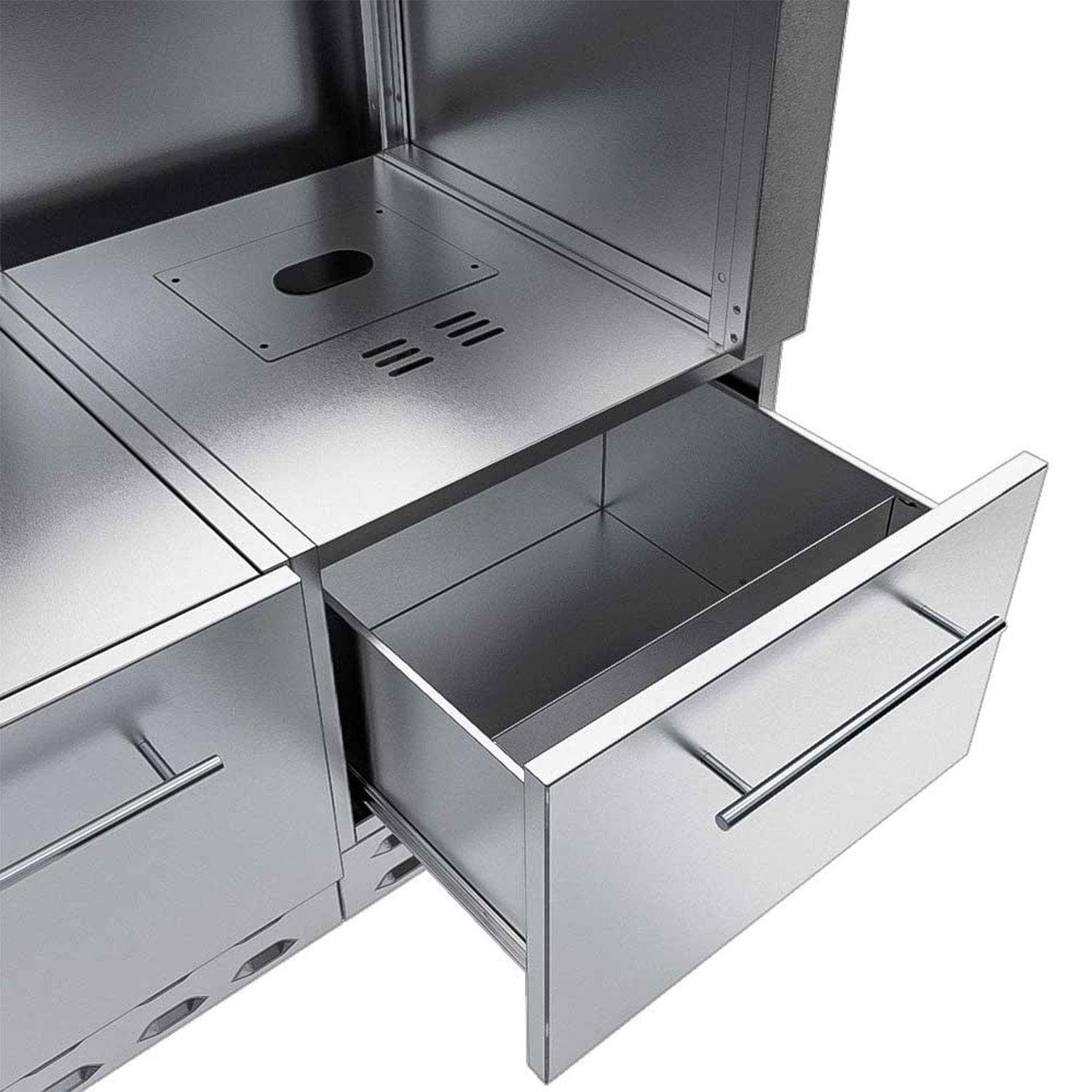 When the cabinet is setup is complete, it will measure in all 44 In. Width x 28-1/4 In. Depth with drawers x 34-1/4 In. Height with the included 4 In. Height Peg Legs which can also be adjusted an additional 1-1/2 In. in Height. It comes with a trim-kit that is installed on the front face of the cabinet, which adapts the cabinet to fit your preferred grill. The cabinet is compatible with grills cut-out sizes between 25-3/8 In. Width and 38 In. Width x 16-1/4 In. Height wo/Rail x 24-1/2 In. Maximum Depth Max Height with counter at 3/4 In. Height, and additional cut-out height can be increased by adding a thicker counter or backer board. Please refer to the cabinet specification sheet for more information on matching your grill's cut-out dimension to the correct trim-kit. All trim-kits must be installed on the cabinet before you attach it to other cabinets to the left or right sides.