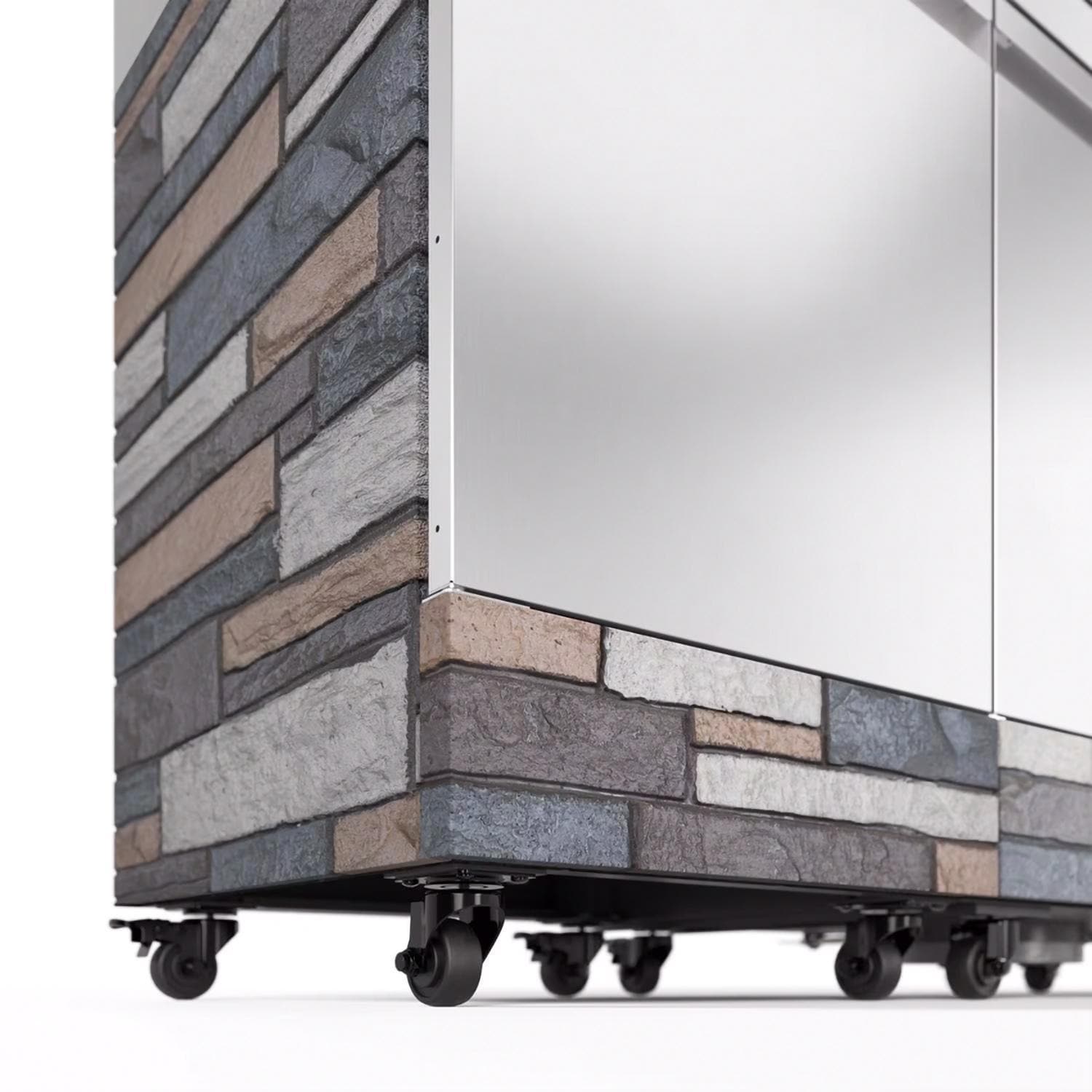 Just received the Gunmetal Grey Island Grill with "Shadow" stacked stone this week and was highly impressed with the ease of assembly! I also agree that the side cabinets need a way to be secured to the center cabinet to avoid the gaps between them. This can be corrected with some self tapping screws I assume. I also noticed that the grill runs hotter at the rear of the grill when compared to the front. Another recommendation I would make is to make the stainless steel ice bin a bit deeper to accommodate the height of standard beer bottles. :-)