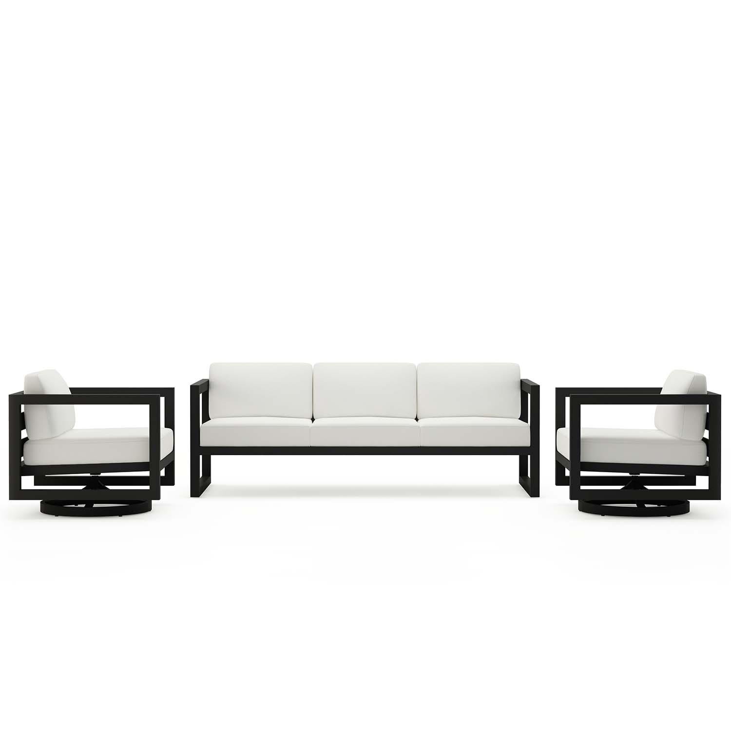 An inspired blend of Midcentury Modernism and contemporary lines, the Misty Cove 3 Piece Sofa Set With Swivel Black/Canvas Natural brings artful design to your outdoor space. The hallmarks of the collection include durable aluminum metalwork, a sleek silhouette, and extra-spacious deep seating. Stain-resistant Sunbrella fabric cushions and weather-resistant powder-coated frames make Misty Cove as sensible as it is stylish.Legal disclaimers and warnings