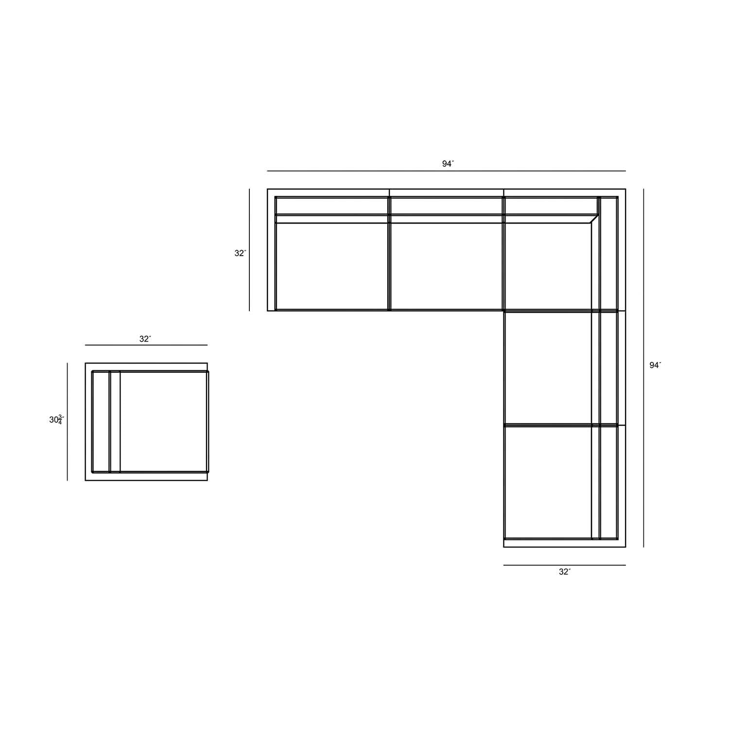 Full Sectional: 32 D X 57 1/2 W X 31 3/4 H. 94 W X 94 D X 26 3/4 H. Corner Section: 32 W X 32 D X 33 H. Middle Section: 30 W X 32 D X 33 H. Club Chair: 30 3/4 W X 32 D X 33 H.