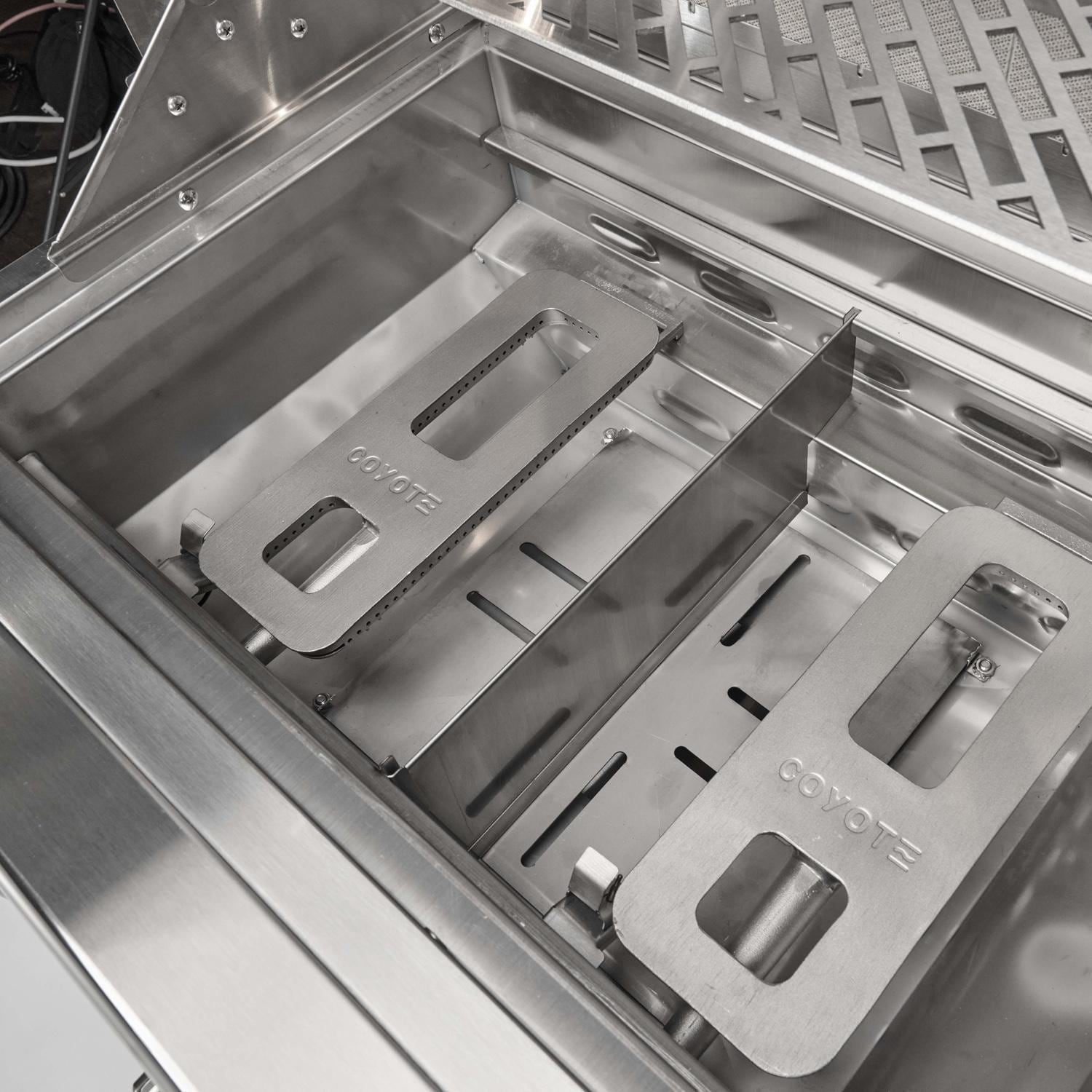 The Coyote SL-Series 30 inch built-in natural gas grill offers innovative safety features & top of the line performance. Built from premium 304 stainless steel, this grill is packed with premium features including a spring-assisted hood, interactive lighting, & warming rack. The Coyote logo throw light not only makes a statement but illuminates your grilling area for the ultimate nighttime grilling experience. The double walled hood provides excellent insulation, helping to retain heat more effectively. The integrated wind guard ensures consistent heat and performance, so you can keep grilling even in windy conditions. The newly updated design also includes sleek knob and bezel styling, an improved end cap, and a sturdy handle for a refined look. Unique volcanic stone briquettes work in tandem with the two powerful Infinity burners to provide excellent heat retention & consistent heat across the laser-cut grates. The interchangeable sear burner, rear burner, & rotisserie kit offer additional versatility, giving you the flexibility to create a variety of dishes. Designed for optimal safety & reliability, the innovative safety valve & thermocouple system allows gas to flow only when a flame is present. If the flame goes out, the thermocouple automatically shuts off the gas, preventing any potential hazards. Grill with peace of mind and enjoy outdoor cooking in your backyard for years to come.