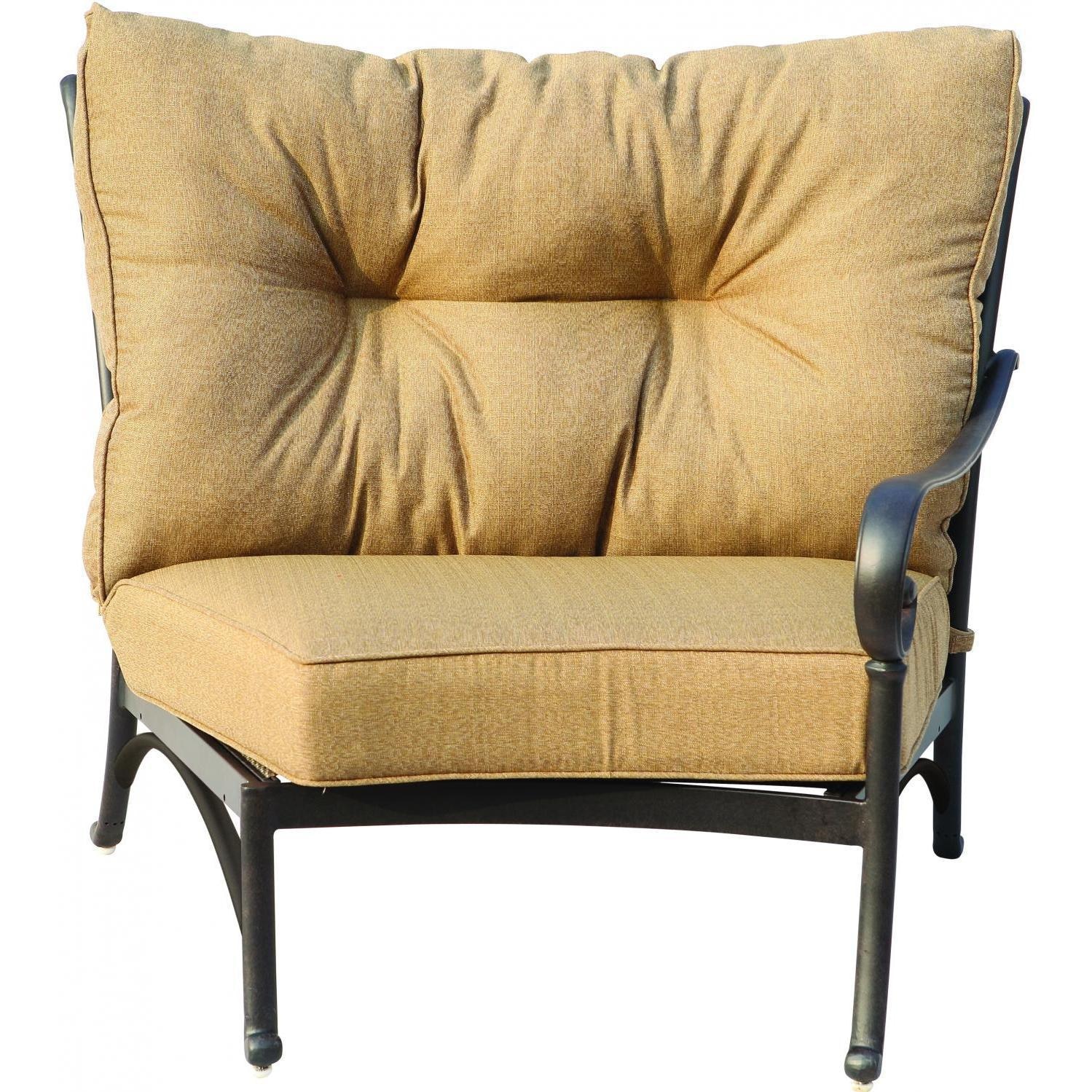 This deep seating, right arm sectional chair bears the signature elegance and curves that are found in the Santa Anita collection. The cast aluminum frame construction is lighter in weight than wrought iron, and is rust resistant. The antique bronze frame is powder coated, making it tougher than conventional paint finishes. This piece can be combined with other sectional pieces to extend your patio seating possibilities. This outdoor deep seating center sectional chair includes a Heather Beige Sunbrella cushion.
