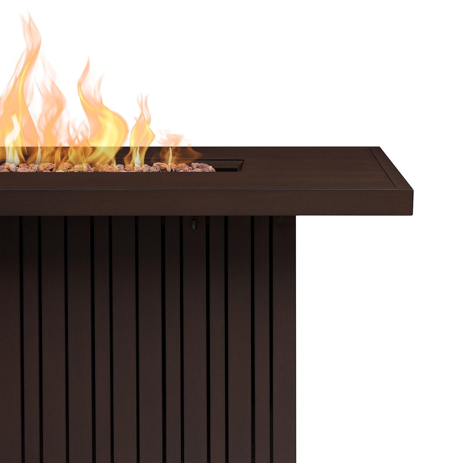- Set includes: fire table with leveling feet, 20.5 in. linear stainless steel burner, burner lid, lava rock filler, storage cover, AA battery, tank seat and 4 ft. LP hose with regulator