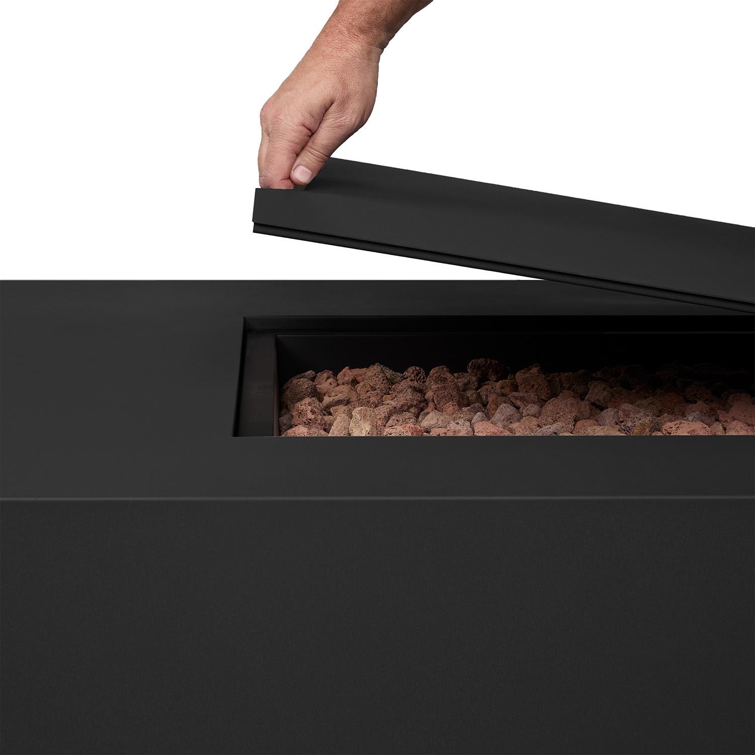 - Set includes: fire table with leveling feet, 30 in. stainless steel burner, burner lid, lava rock filler, storage cover, AA battery, tank seat, 9 ft. LP hose with regulator and natural gas conversion kit with 10 ft. NG hose and quick connect socket