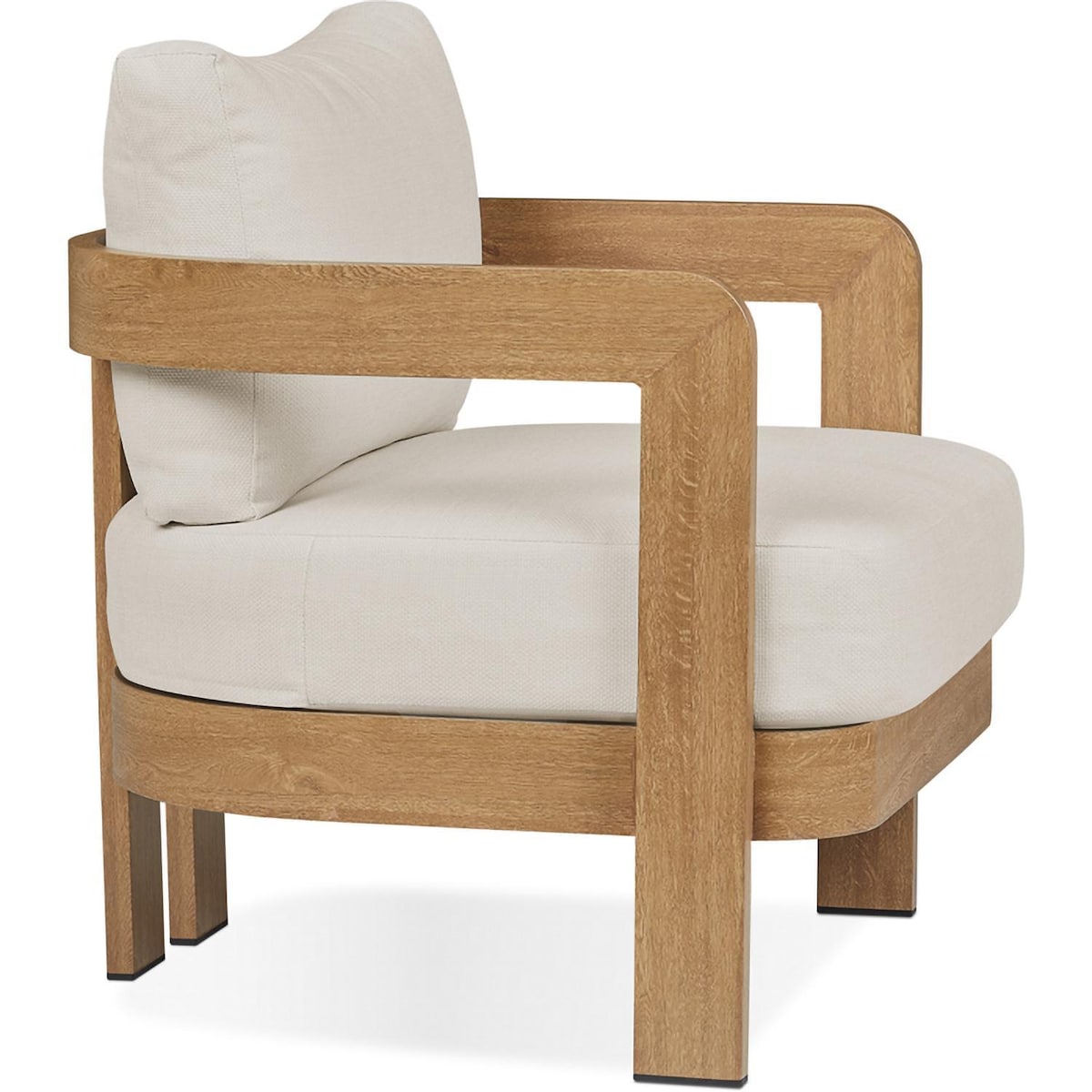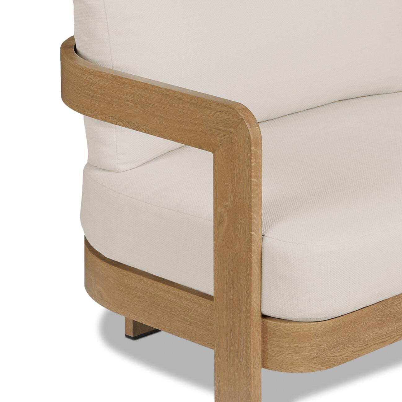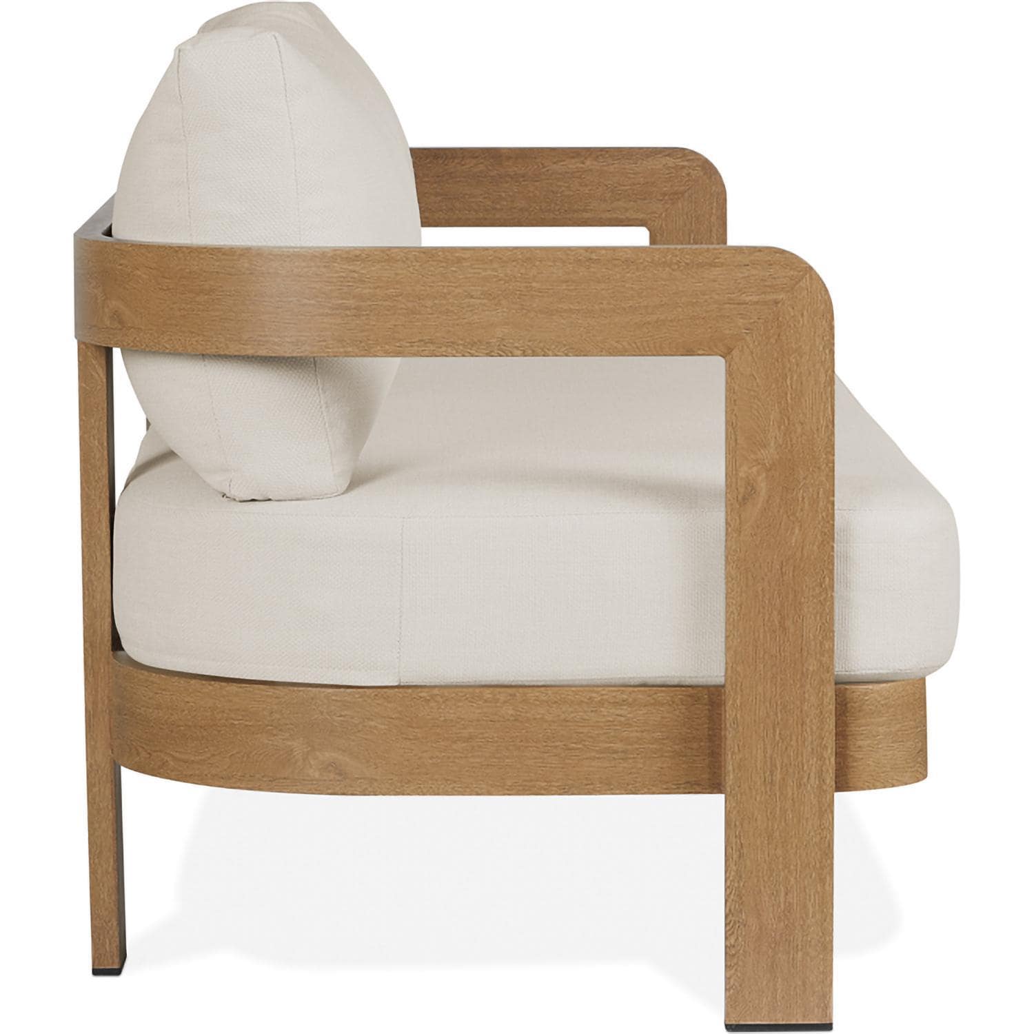 Relax in style with the Bocage outdoor chair. This modern patio chair has a unique curved design with a sturdy aluminum frame that is coated to look like natural wood. This allows you to enjoy the aesthetic appeal of a wood―like appearance while benefiting from the durability of a lasting metal frame. The frame is weather and sun resistant and rustproof. The off―white cushions are weather, sun and mold resistant with removable covers for convenient maintenance and cleaning. Fasteners keep the seat cushion securely tied to the frame during windy weather. Includes chair with cushions and arrives fully assembled. At Lakeview Outdoor Designs, we are committed to providing beautifully designed, safe, high―quality indoor electric fireplaces, outdoor gas fire pits and fire tables, and outdoor furniture.