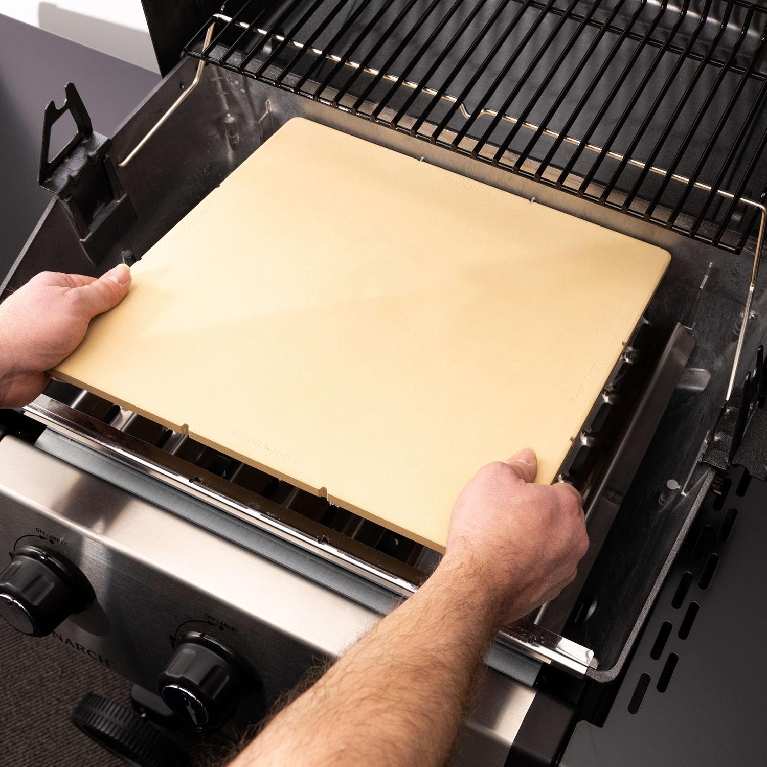 - Reversible stone holds heat to quickly cook pizzas on the grill