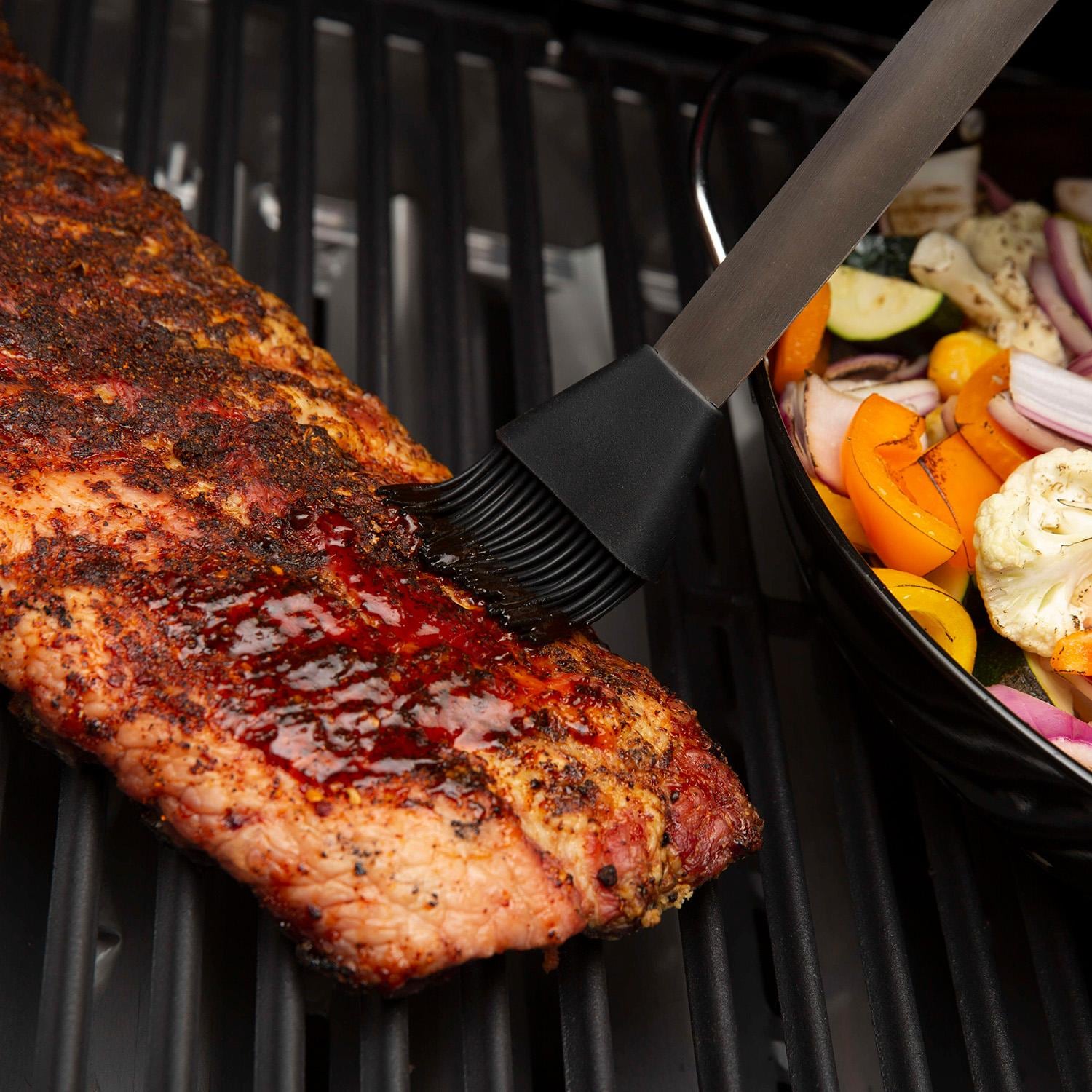 - Set includes turner. locking tongs, silicone basting brush, set of 4 V-shaped skewers