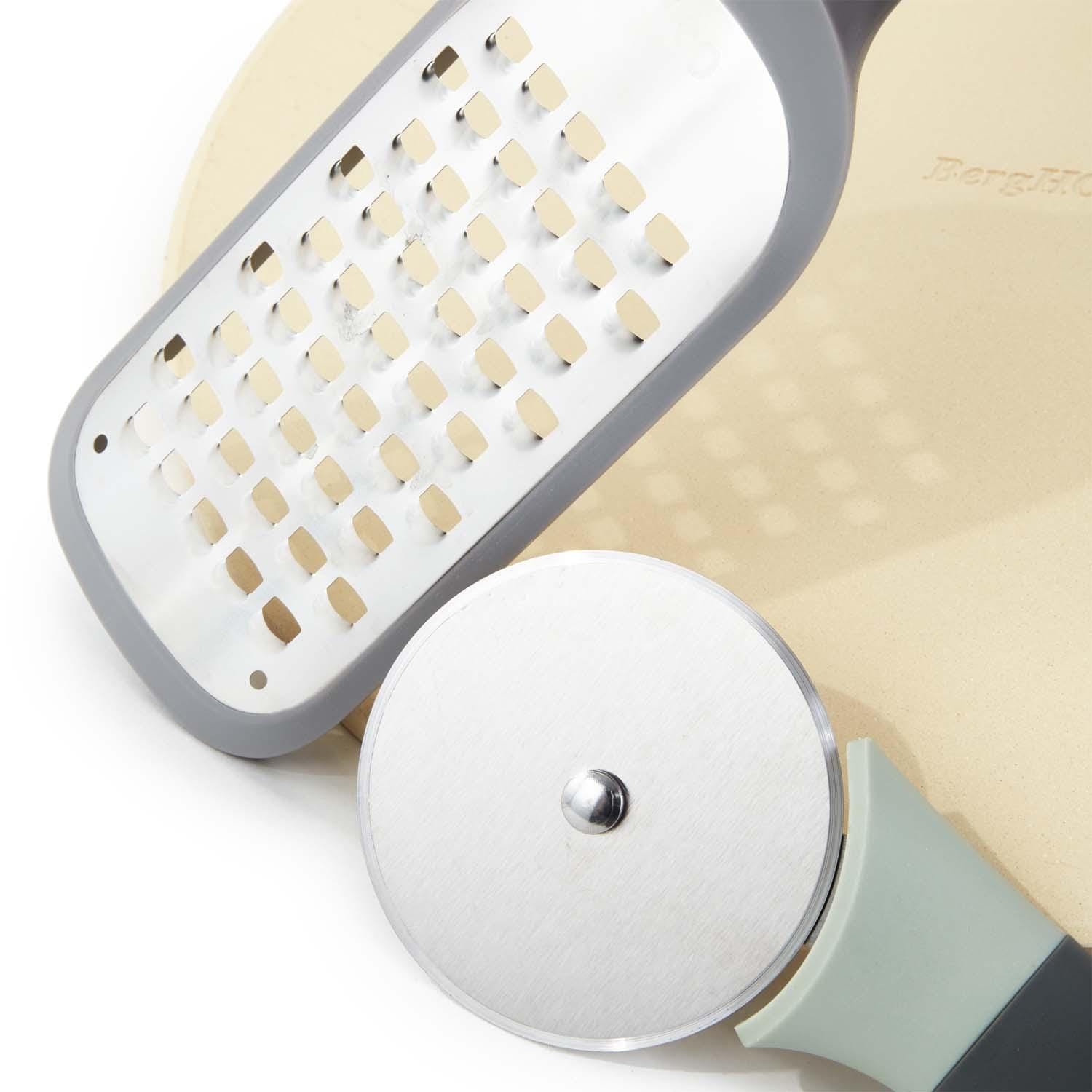 - Set Includes: 14 cordierite pizza stone, stainless steel pizza cutter, ultra-coarse paddle grater, ergonomic comfort-grip handles