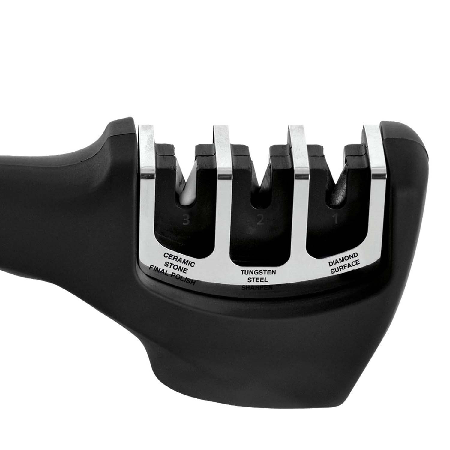 - 3-in-1 ABS sharpener with diamond, tungsten, ceramic stages; 3 slots for versatile knife care