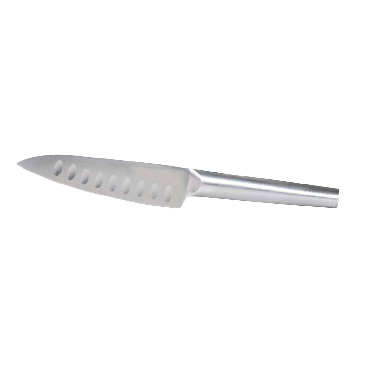 - Set Includes: 7-in and 5-in Santoku knives, 4.5-in Santoku, 7-in cleaver, ergonomic 3-slot sharpener. 18/10 stainless steel