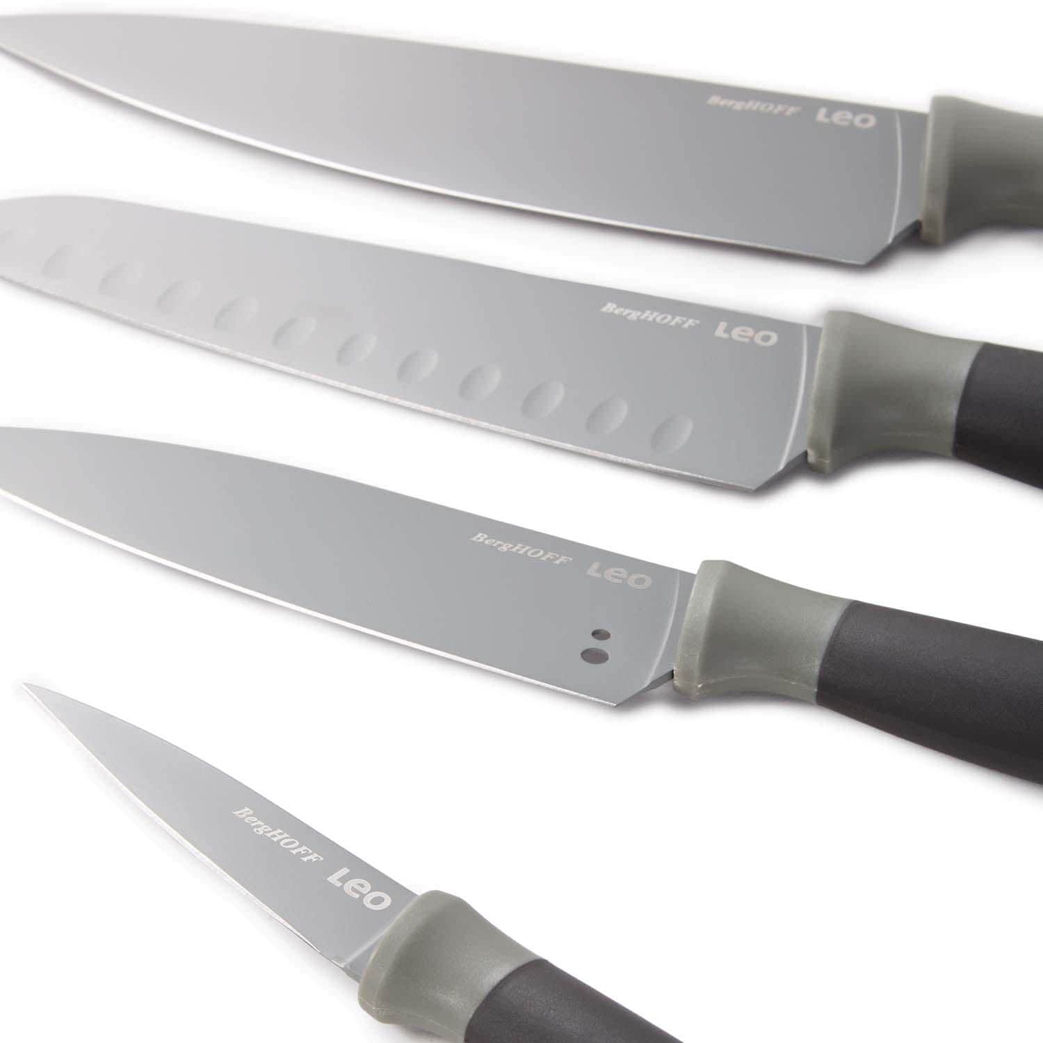 - Set Includes: 4 stainless steel knives with soft-grip handles, protective sleeves; paring, small chef's, chef's, and santoku knives