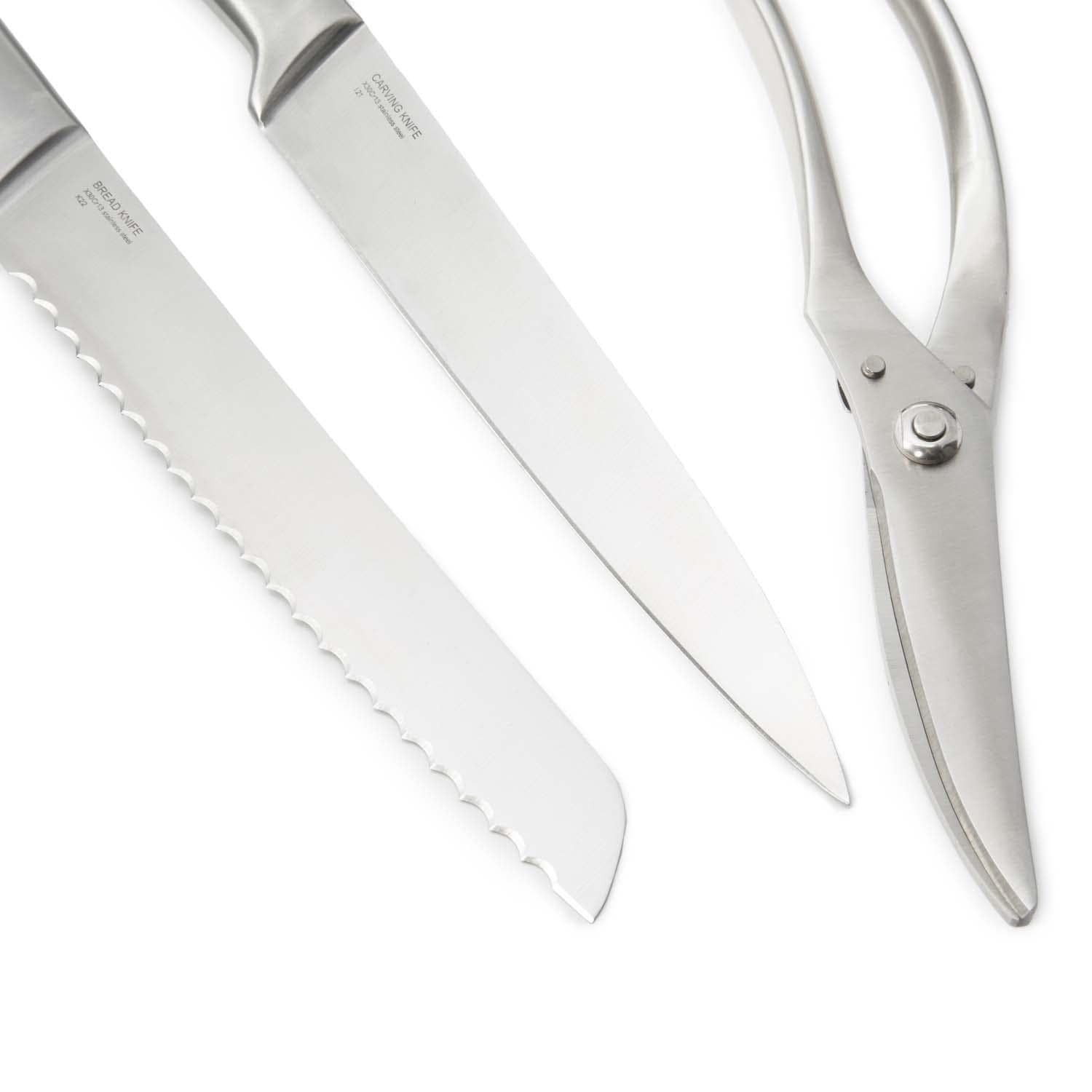 - Set Includes: 8-in Bread Knife, 8-in Carving Knife, 9-in Poultry Shears; stainless steel; satin finish; ergonomic hollow handles
