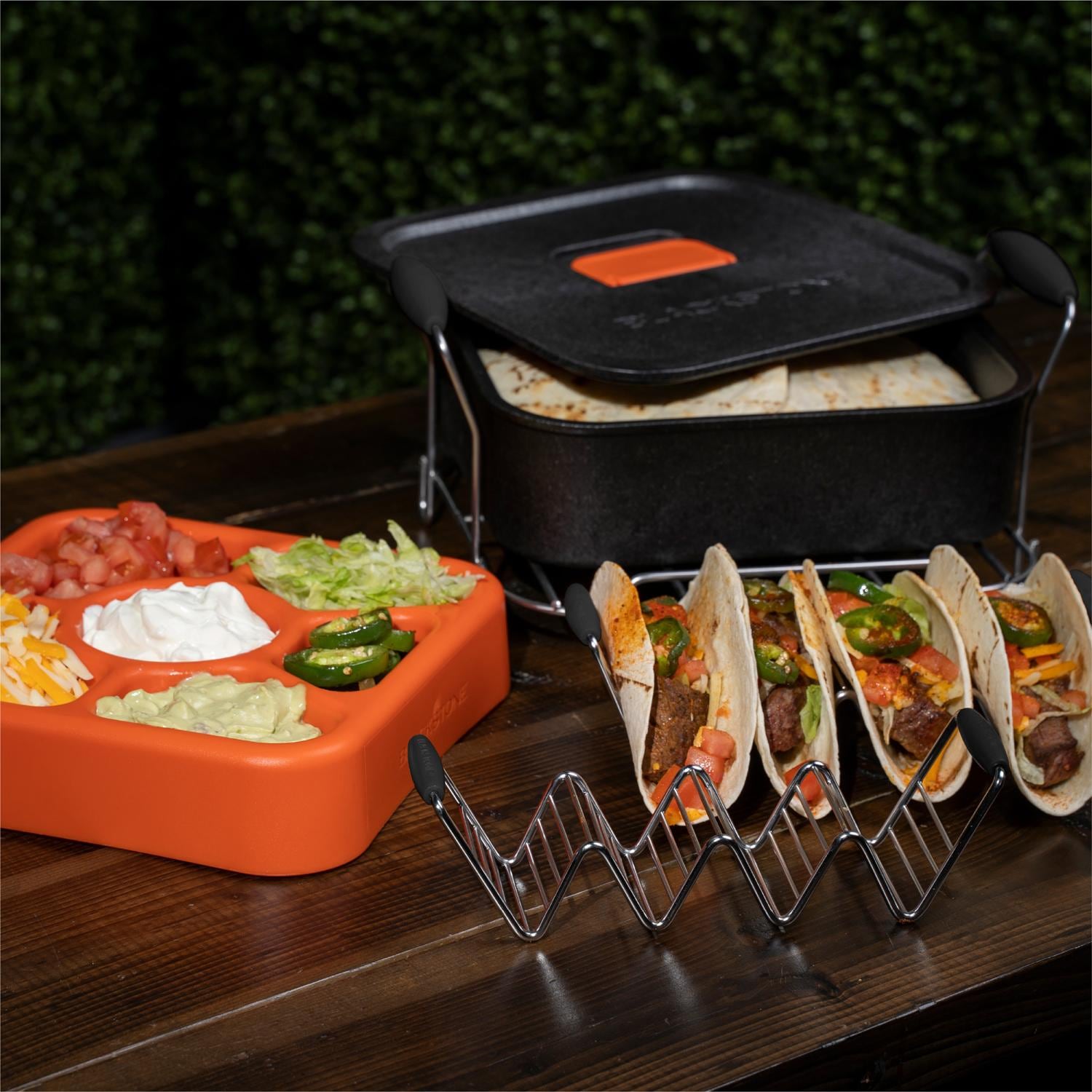 - Includes tortilla warmer trivet (Qty. 1), tortilla warmer (Qty. 1), toppings tray (Qty. 1), and wire taco racks (Qty. 2)