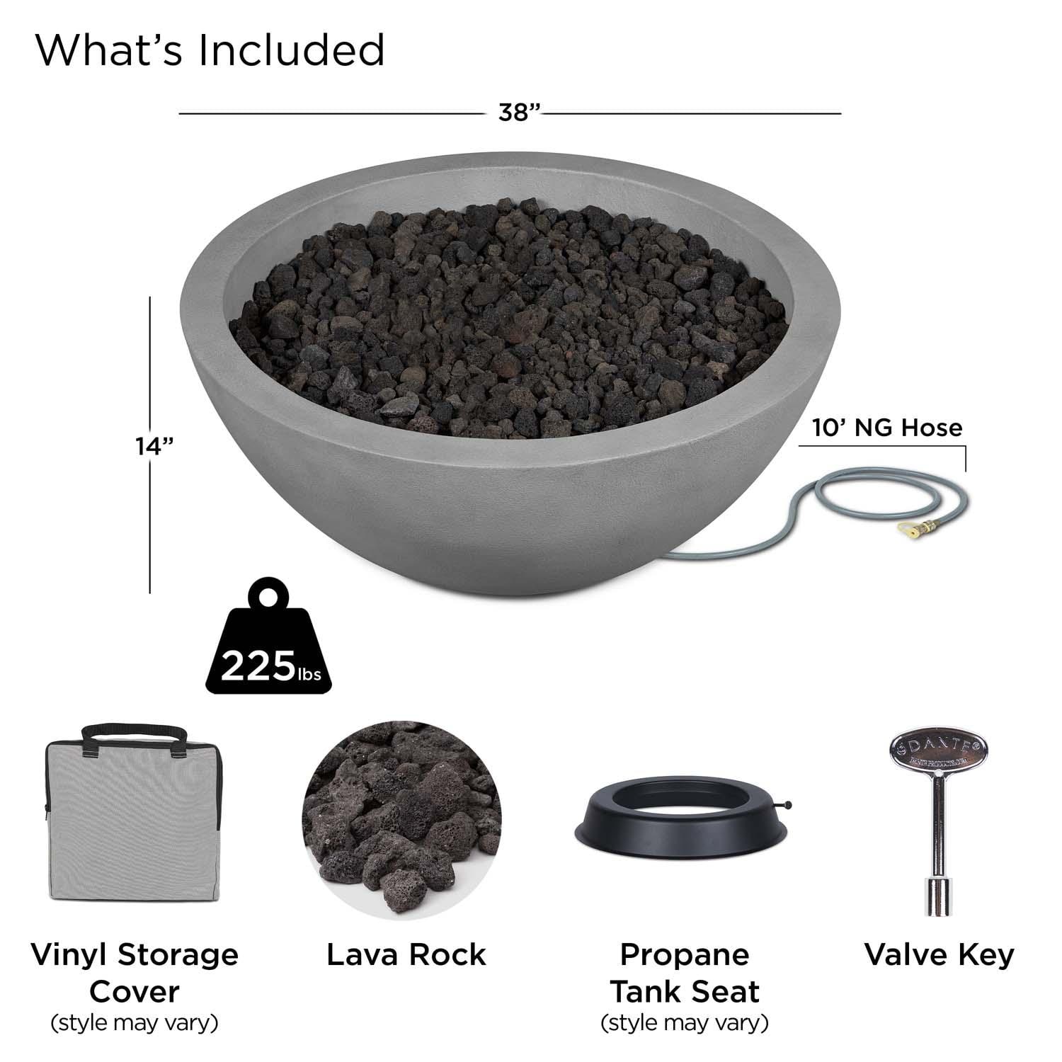- Includes fire table with brass burner, black lava rock filler, valve key, storage cover, tank seat and 8' LP hose with regulator