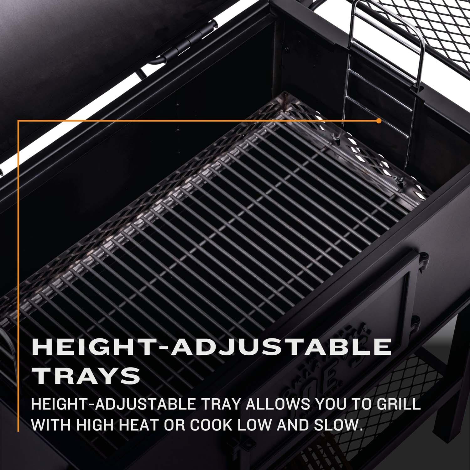 - FUEL: Charcoal fuel with height-adjustable tray allows you to grill with high heat or cook low and slow