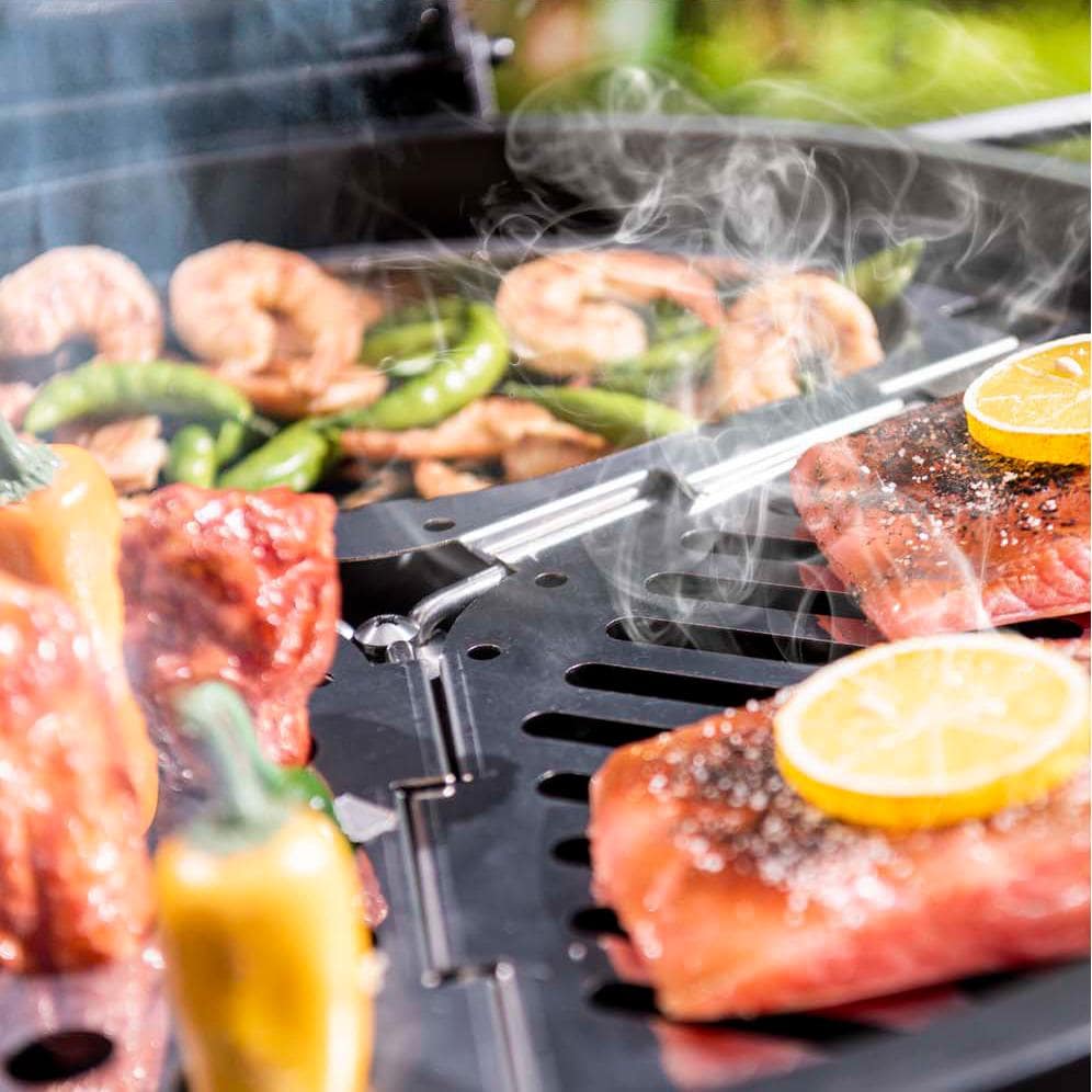 - Three-piece modular design lets you cook an array of food, such as chicken legs, seafood and vegetables
