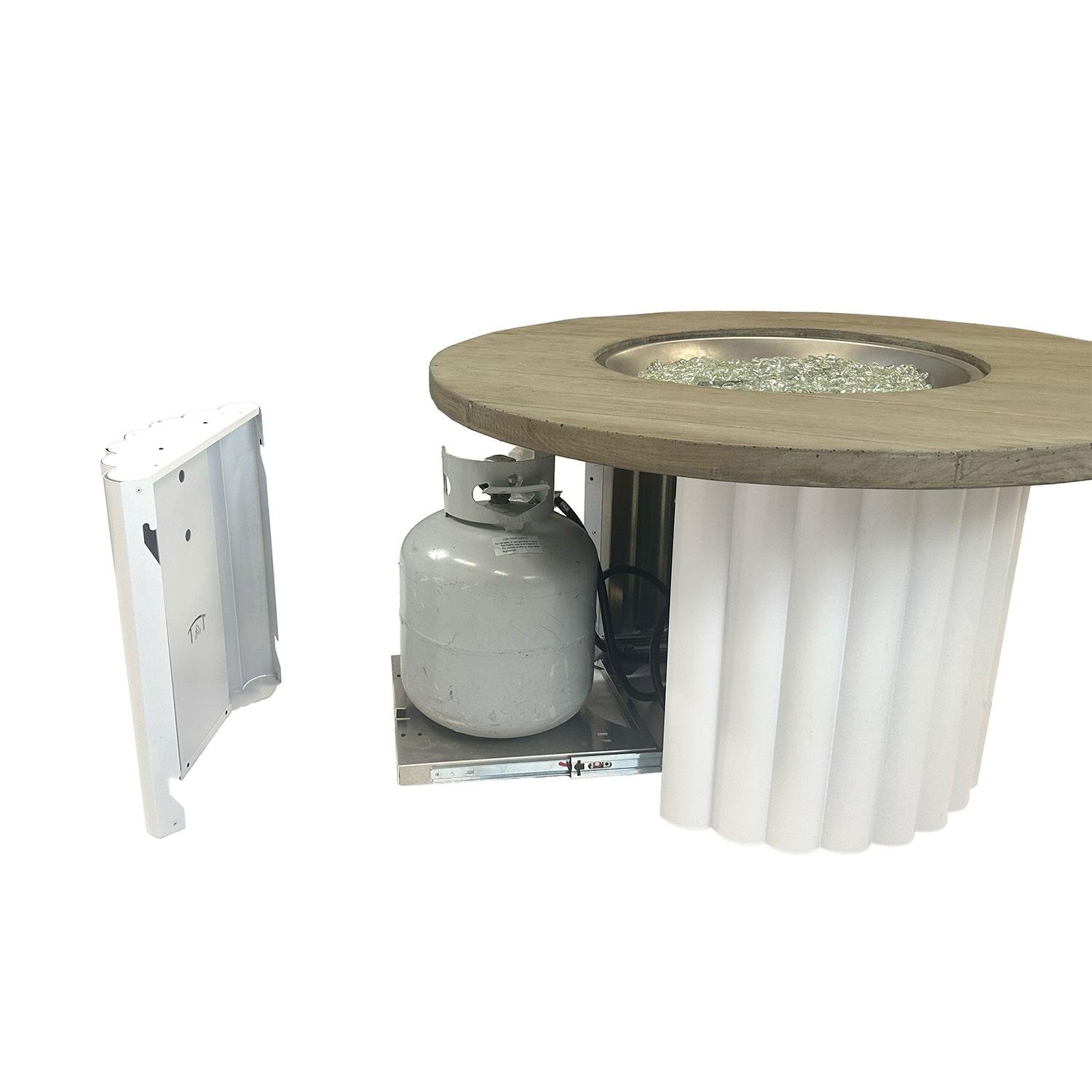 The rust-resistant aluminum scallop base, powder-coated in Charcoal Grey, Black, Brown, or White, blends durability with elegance and cleverly conceals a 20 lb. propane tank behind a sliding access door. Set up for liquid propane but easily convertible to natural gas with the included conversion kit, the Reverie adapts to your needs.