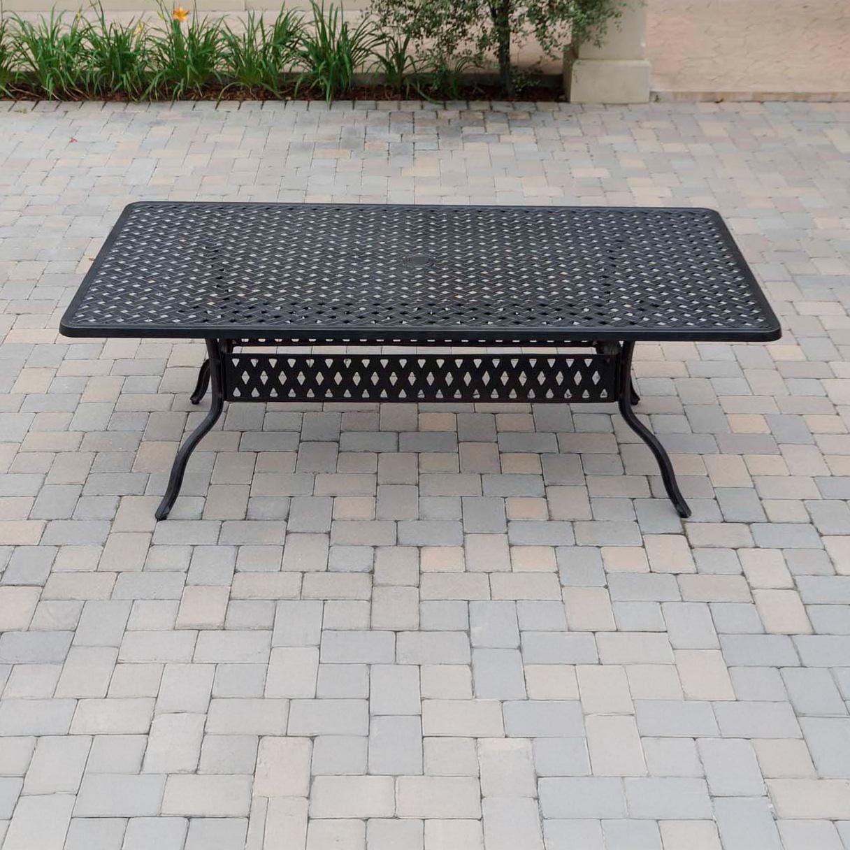 - 100% solid, heavyweight cast aluminum dining table features a durable one-piece tabletop and a built-in umbrella hole